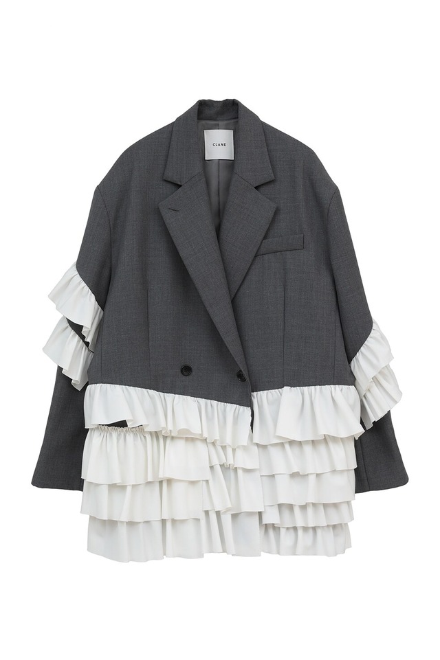 今シーズンのテーマ “HUG” を象徴する、マニッシュなジャケットに、フェミニンなフリルディテールをふんだんに施した一着。