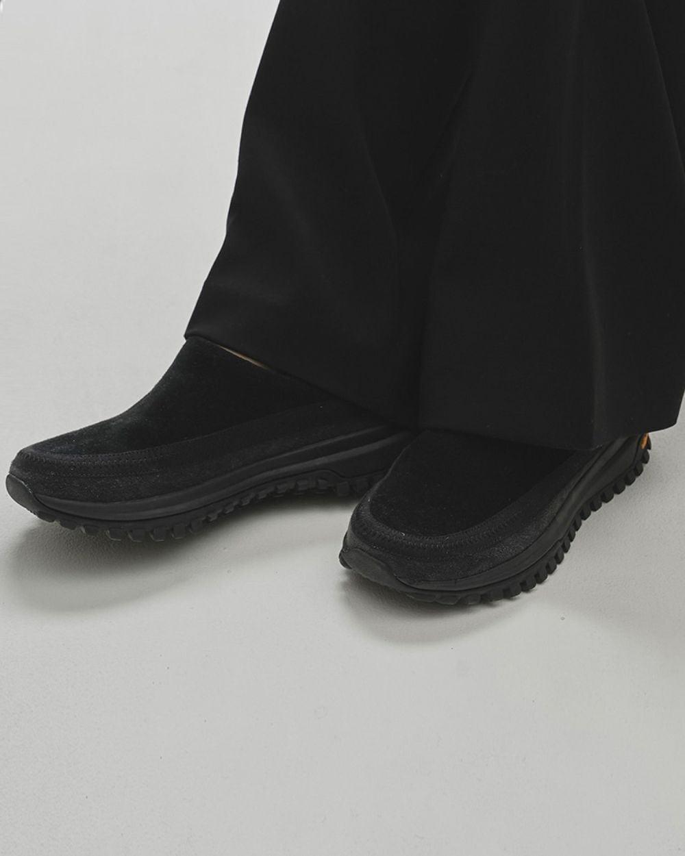ビブラムソールを採用したレザーサボ。アッパーとサイドには2色のスエード素材を使用し、間にテープを巻くことでデザインにアクセントを与えます。シンプルでありながらもゆったりとしたフォルムが存在感を放つ一足です。