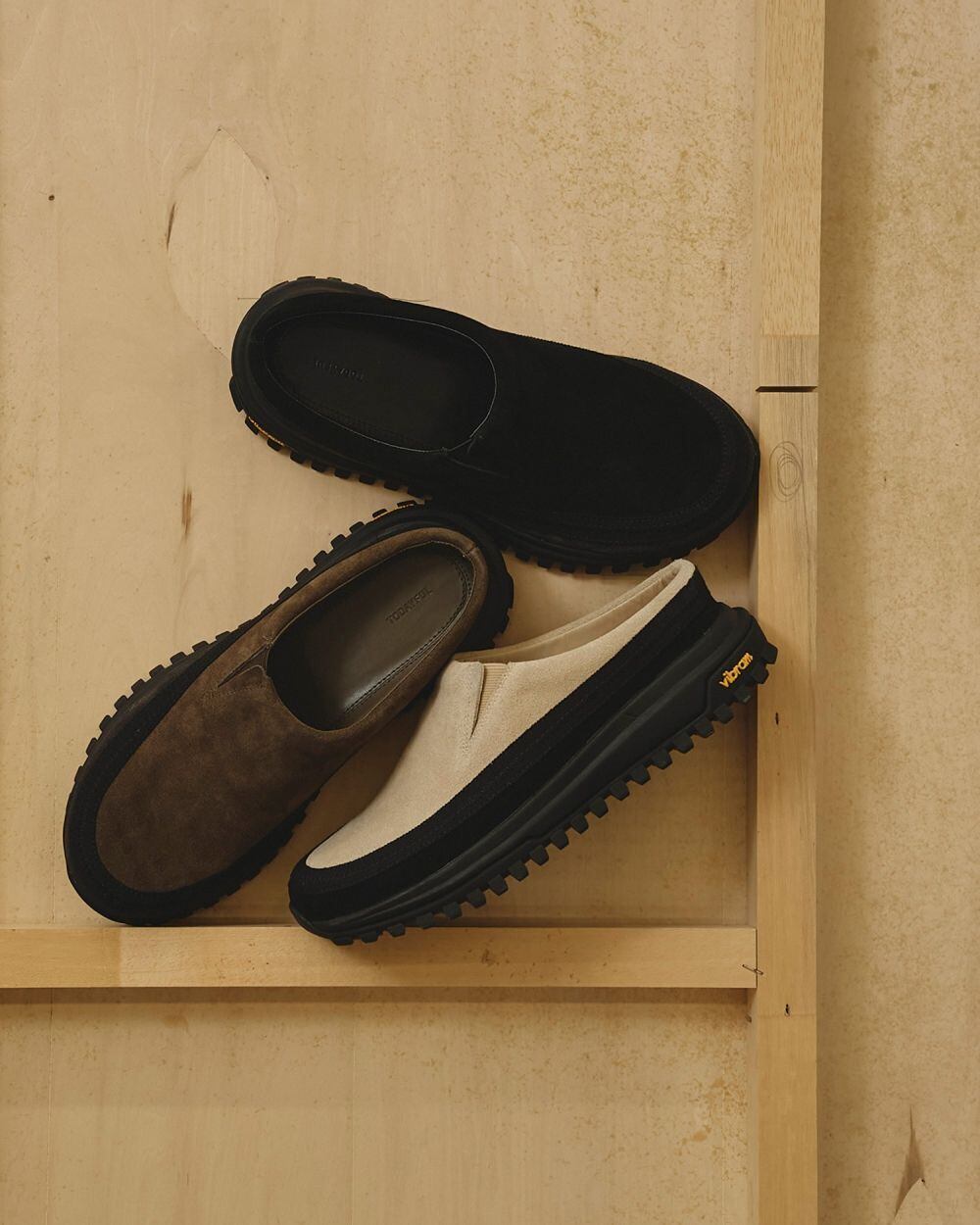 ビブラムソールを採用したレザーサボ。アッパーとサイドには2色のスエード素材を使用し、間にテープを巻くことでデザインにアクセントを与えます。シンプルでありながらもゆったりとしたフォルムが存在感を放つ一足です。