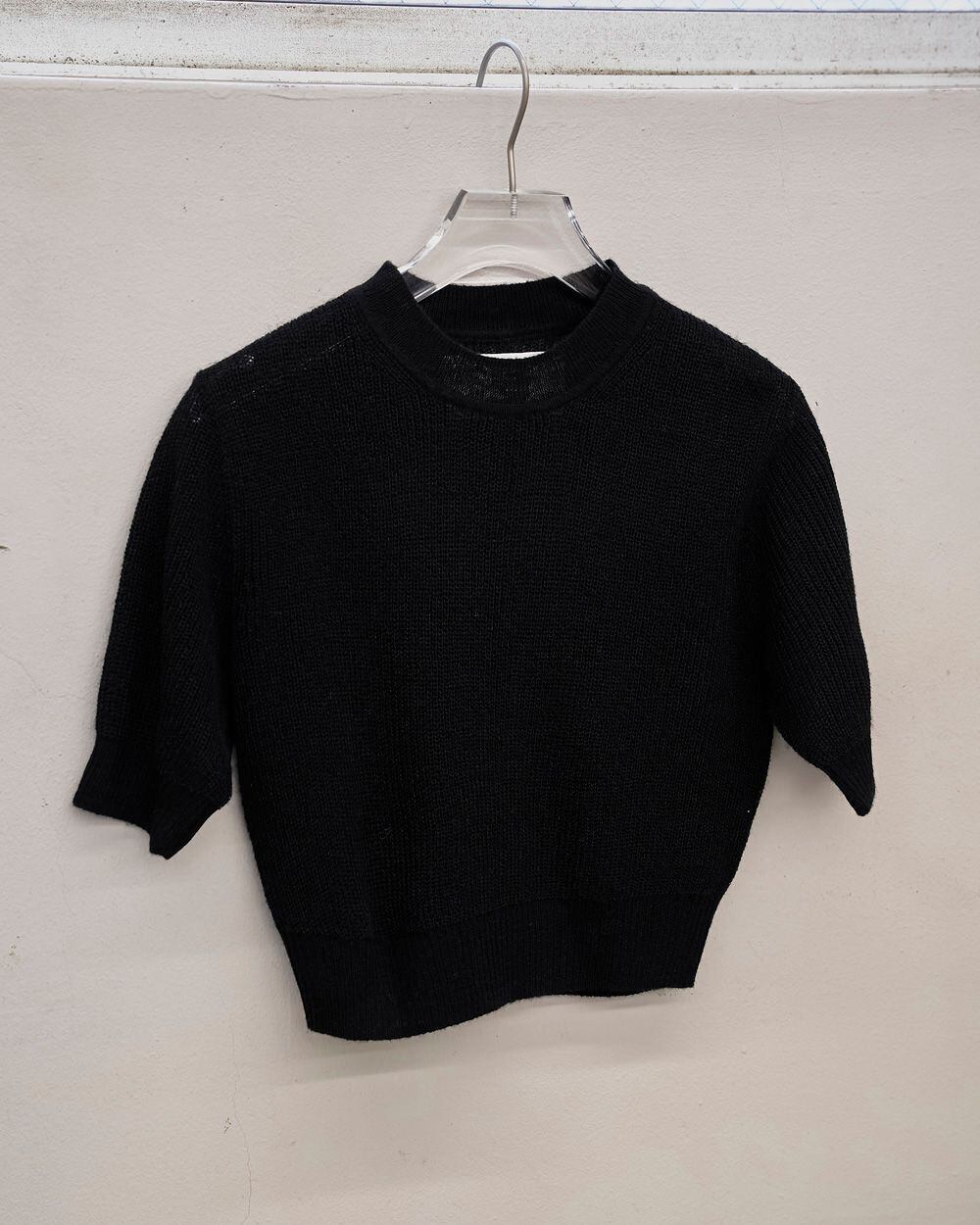 繊細な透け感が魅力のハーフスリーブニット。モヘア混の糸で仕立てた軽やかな編地は、通気性にすぐれながらも上品な温もりを感じさせ、季節の変わり目に心地いい一着。身体のラインをひろいすぎない絶妙なサイジングと短めの着丈がハイウエストのボトムと好相性。洗練された抜け感を演出します。