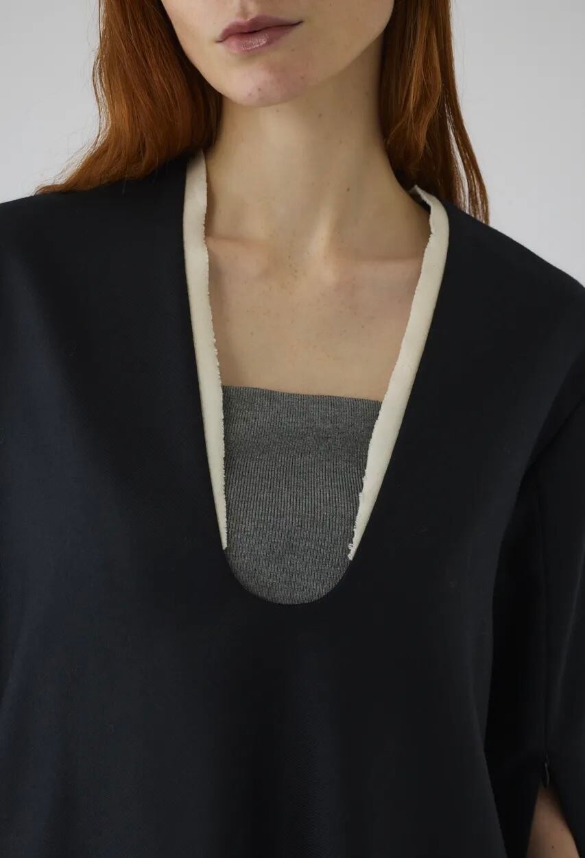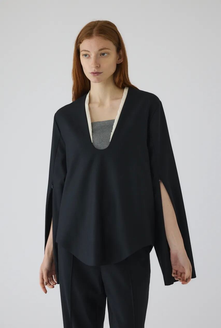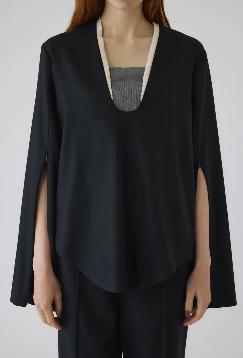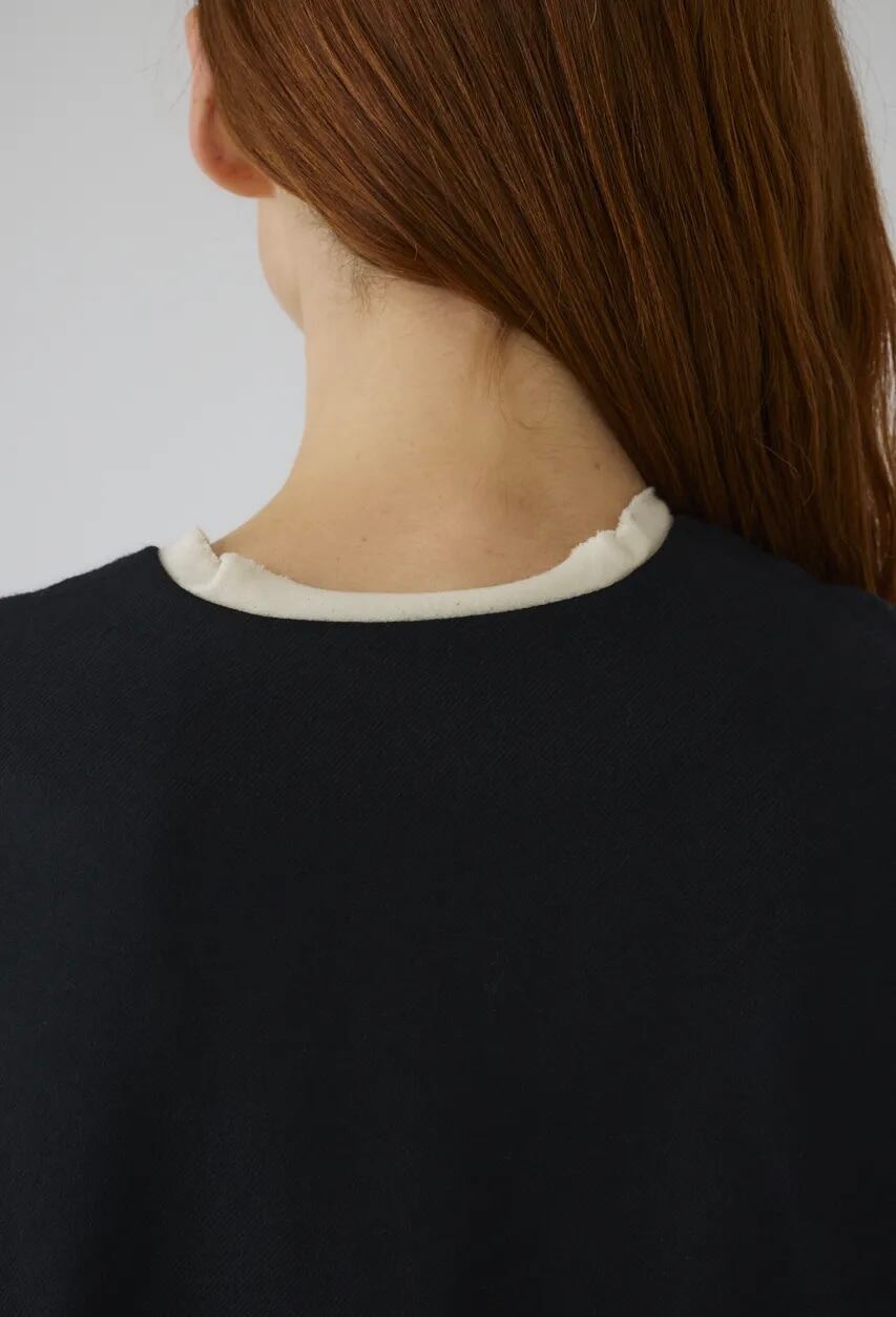 ■DETAIL:袖口にはコンシールファスナーを施し、深いUネックから別布が覗くデザインがモダンでシックな印象を演出。