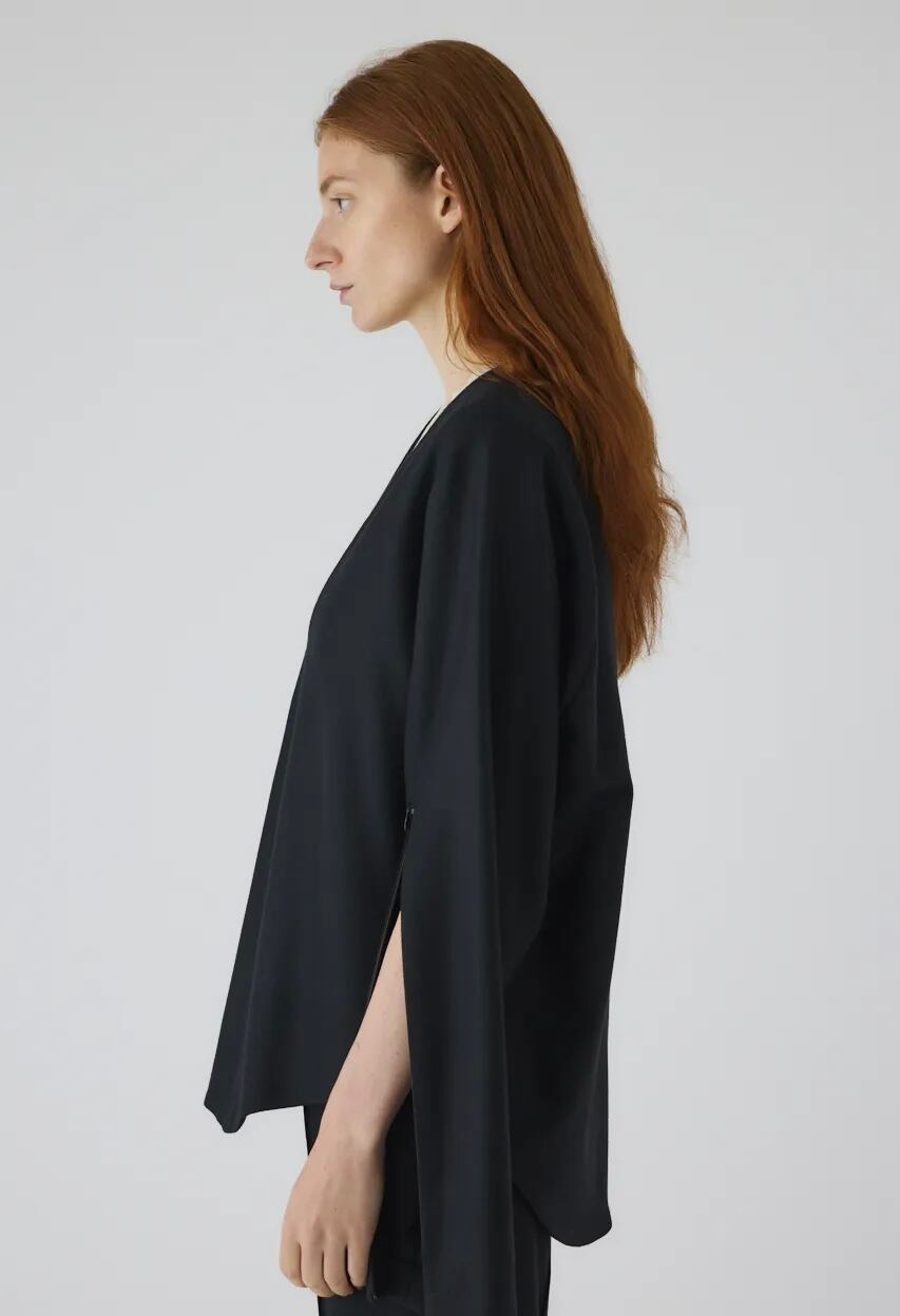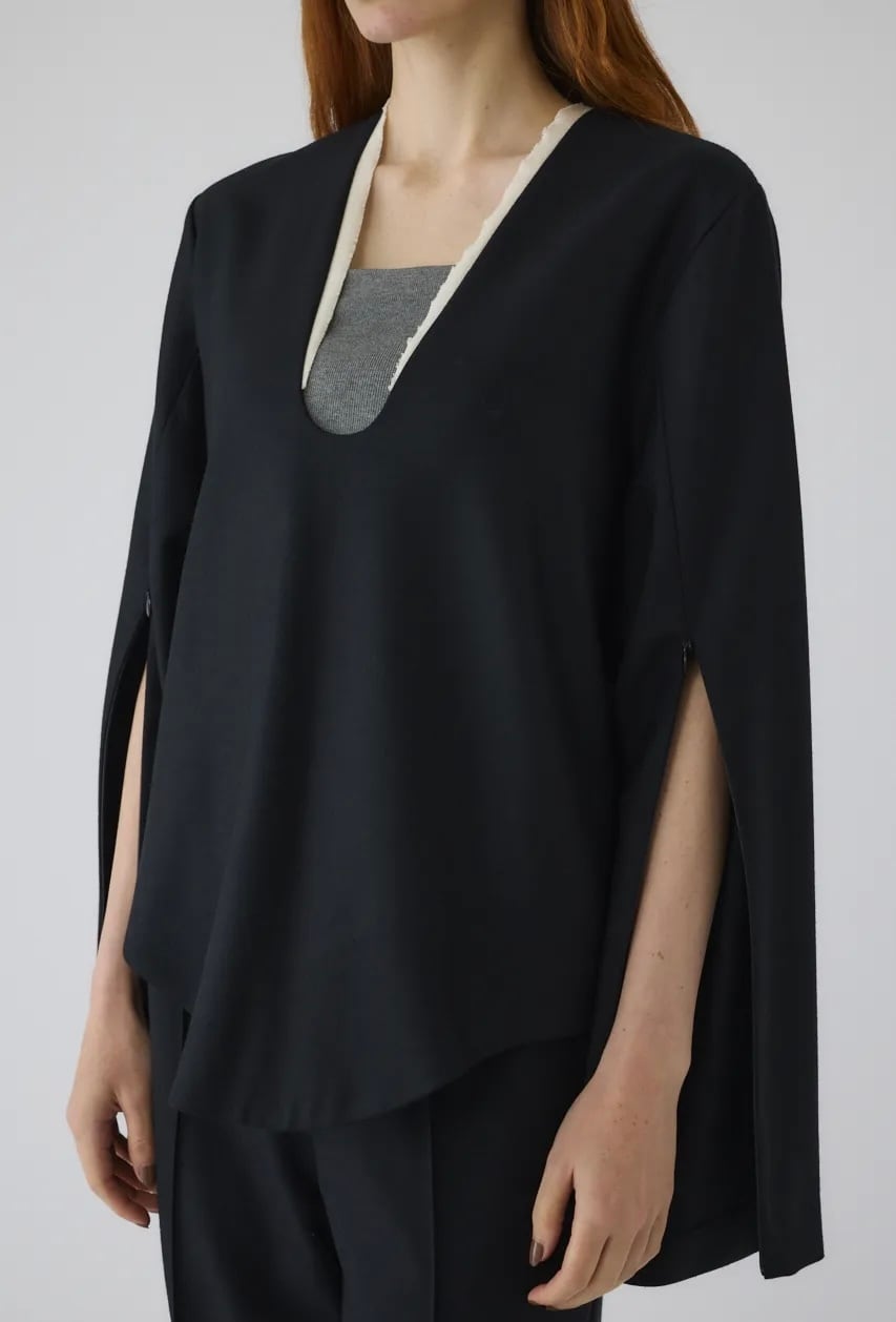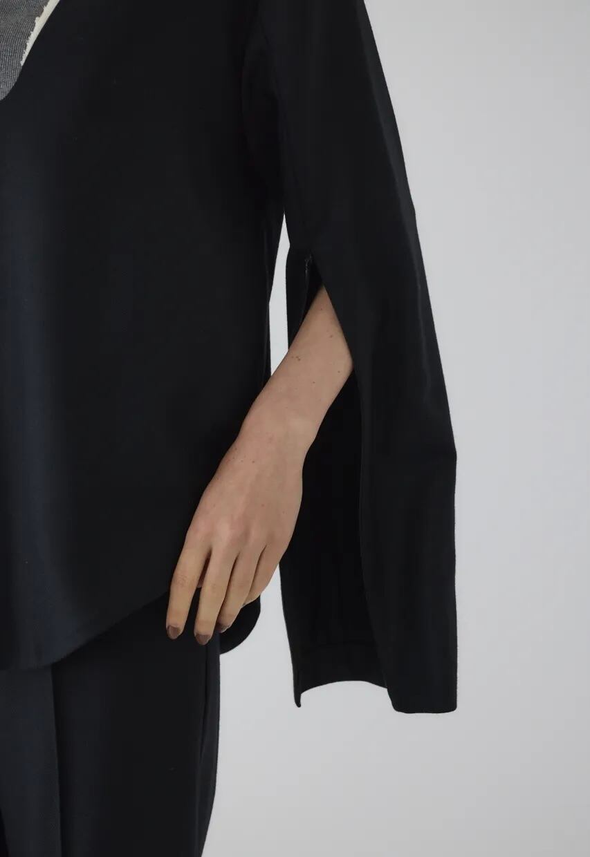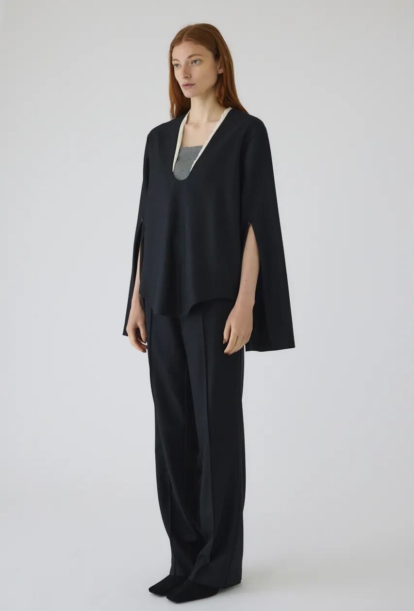 ■DETAIL:袖口にはコンシールファスナーを施し、深いUネックから別布が覗くデザインがモダンでシックな印象を演出。