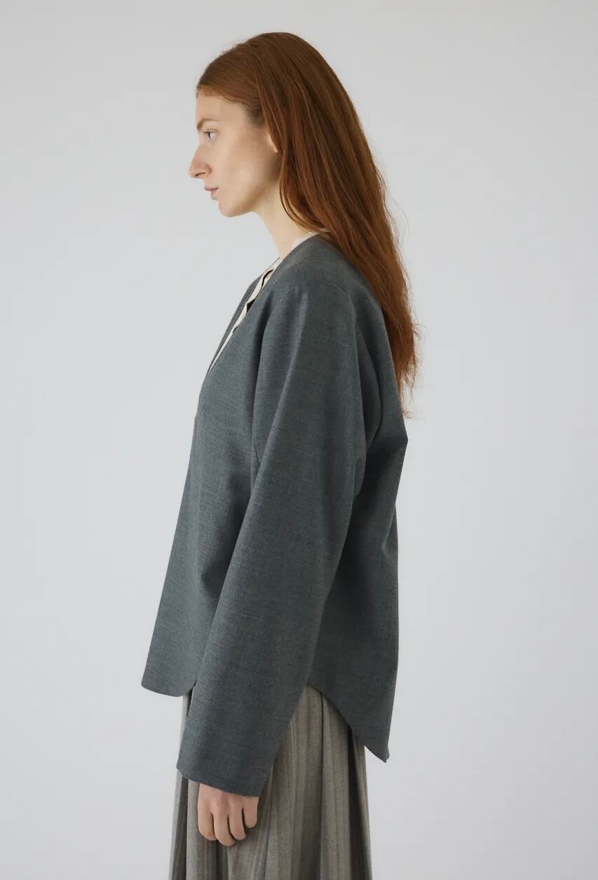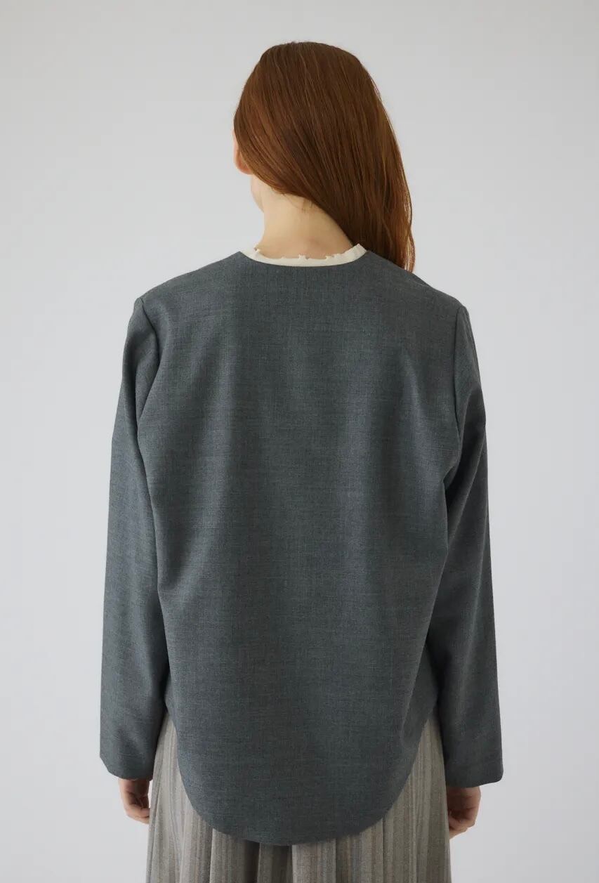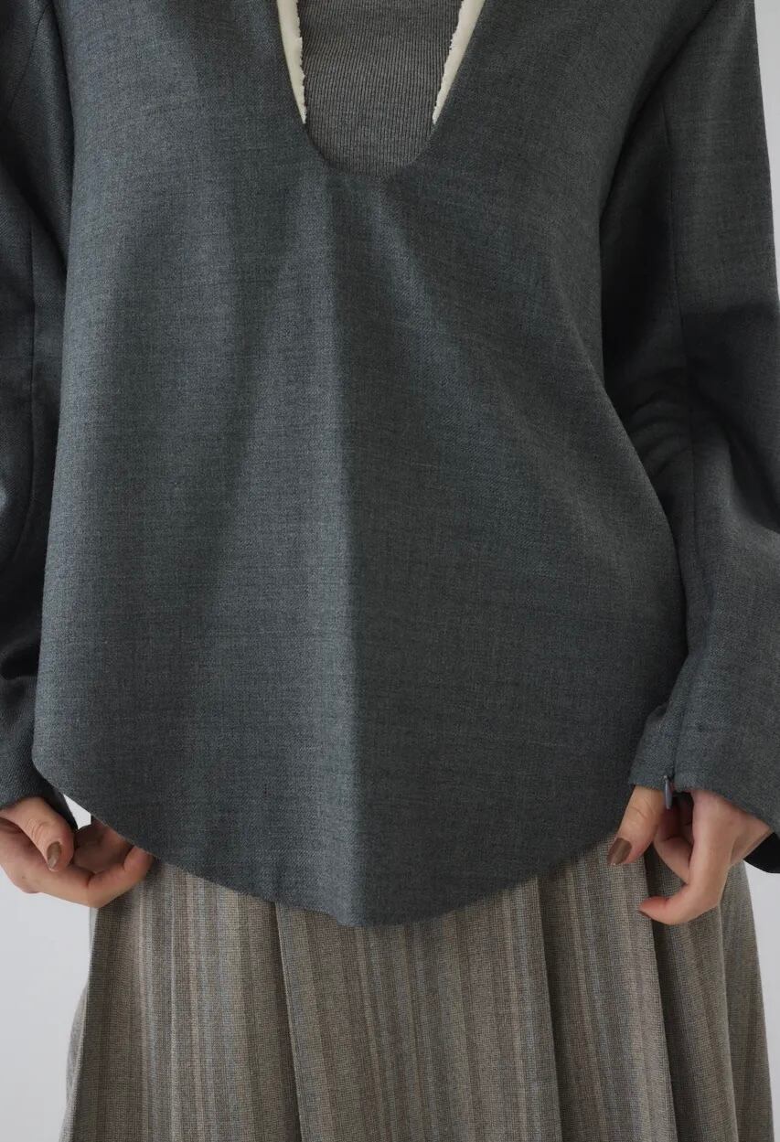 ■POINT:カシミアのような光沢感とソフトで膨らみのある軽いタッチが特徴のオフスケールしたウール糸を使用したストレッチサキソニーのトップス。