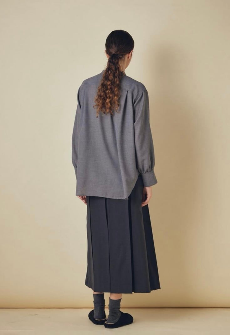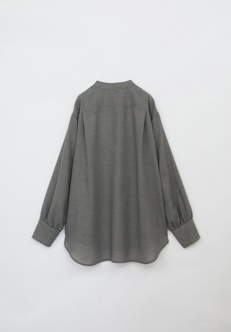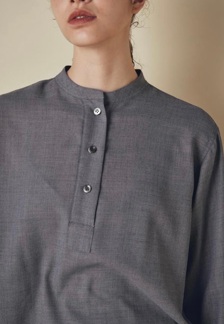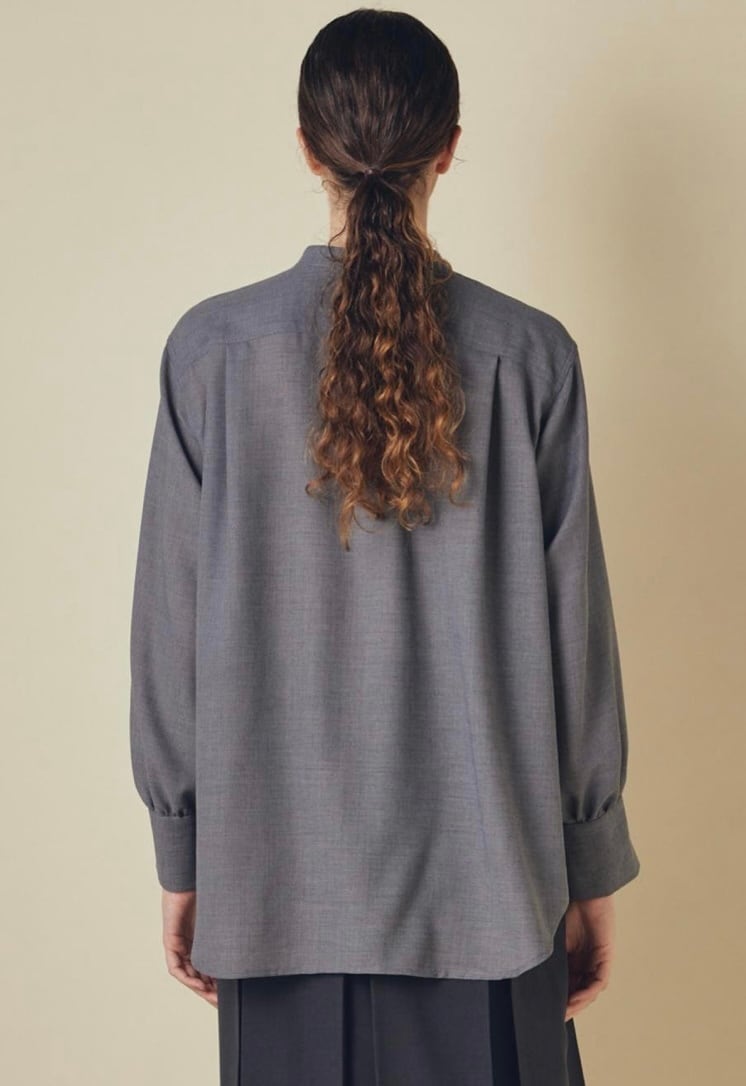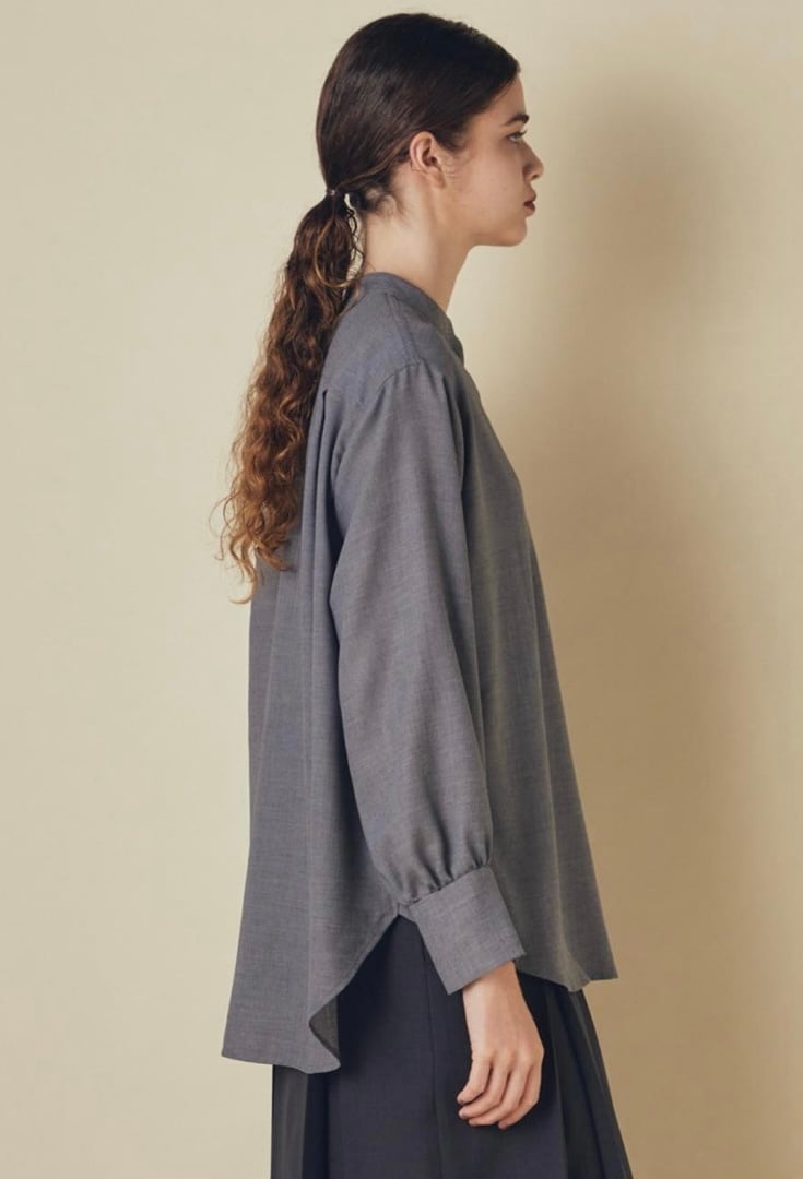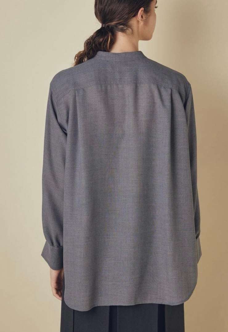 ウールとリサイクルポリエステルの細番ての糸を使用したブラウスです。柔らかさと軽さを兼ね備えた生地感で、ウール特有の温かみを持ちながらもポリエステル混によってしなやかさと扱いやすさを両立しています。フロントはすっきりしたバンドカラーに、胸元までのボタンでシンプルながらも上品さの漂うデザインでデイリーにもオフィスシーンにも活躍します。ややラウンドした裾、袖口のデザインで自然な抜け感を添え、パンツにもスカートにも合わせやすい1枚です。