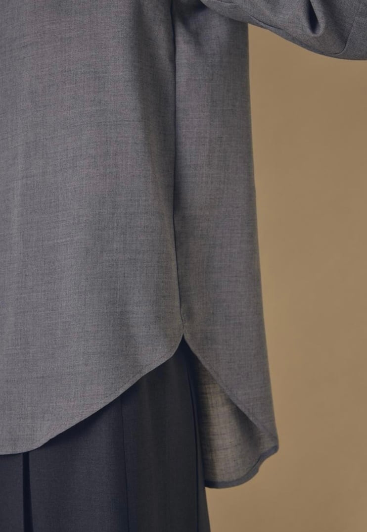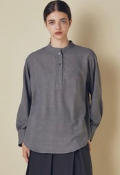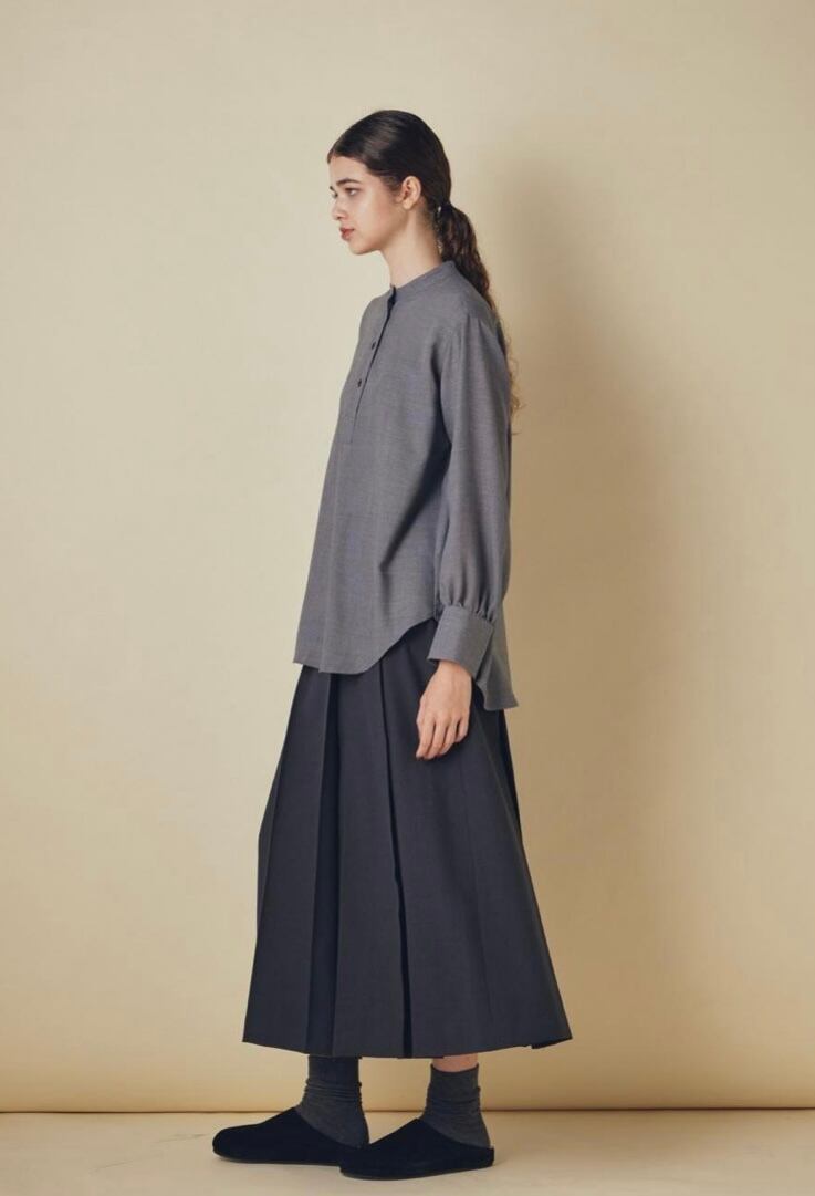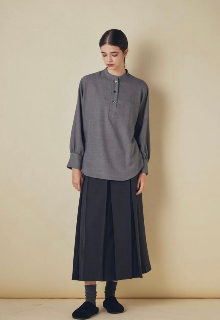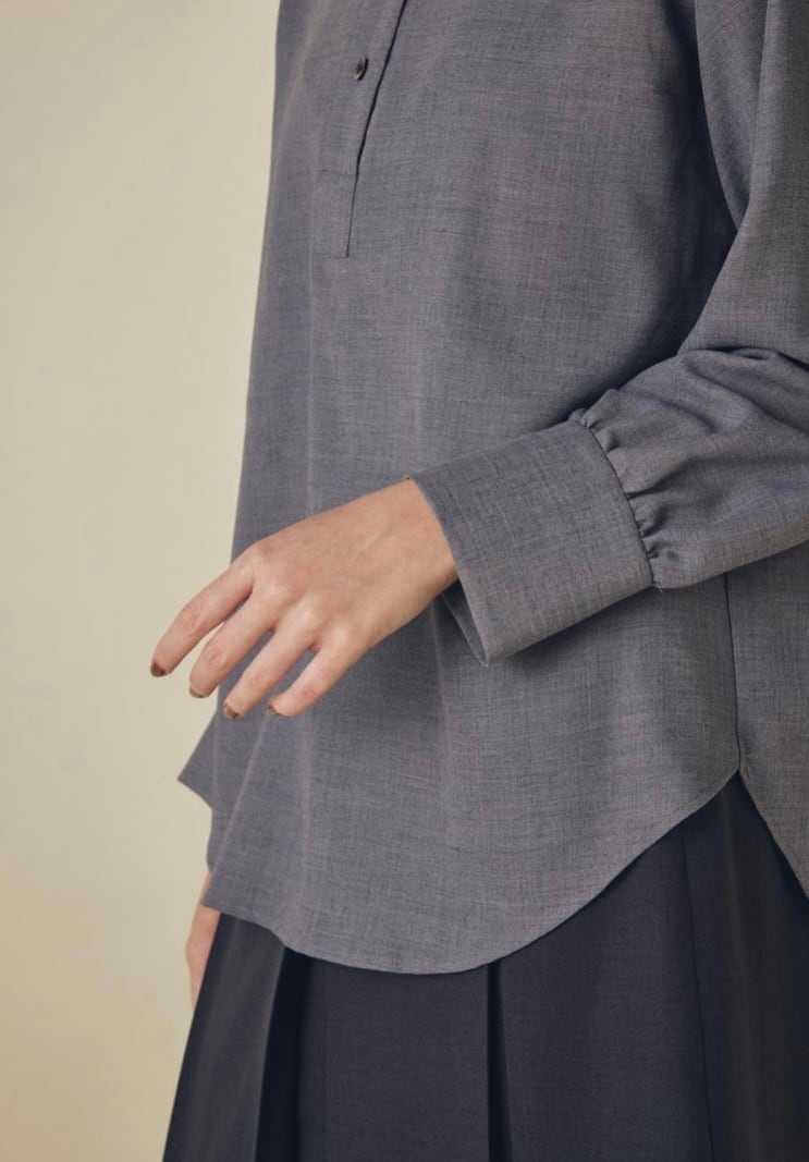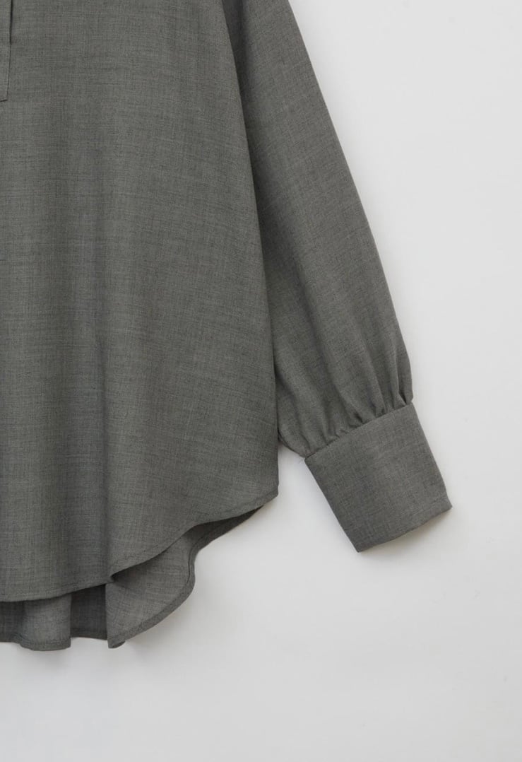 ウールとリサイクルポリエステルの細番ての糸を使用したブラウスです。柔らかさと軽さを兼ね備えた生地感で、ウール特有の温かみを持ちながらもポリエステル混によってしなやかさと扱いやすさを両立しています。フロントはすっきりしたバンドカラーに、胸元までのボタンでシンプルながらも上品さの漂うデザインでデイリーにもオフィスシーンにも活躍します。ややラウンドした裾、袖口のデザインで自然な抜け感を添え、パンツにもスカートにも合わせやすい1枚です。