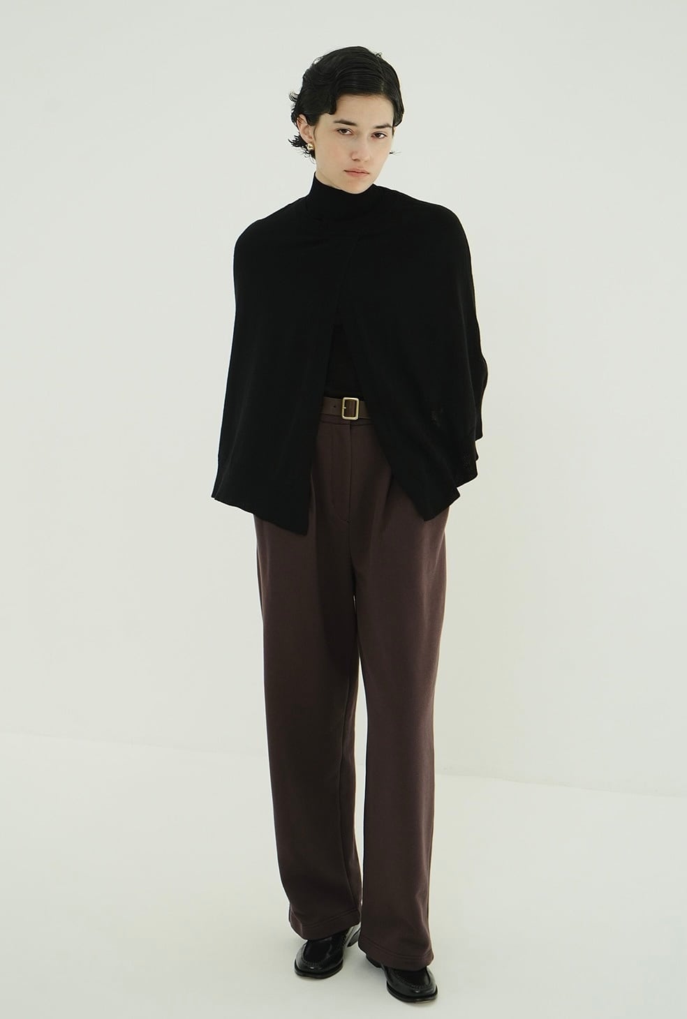 タックによって腰まわりにゆとりを持たせ、リラックス感のある快適な穿き心地に仕上げました。スウェット特有のカジュアルさは残しつつ、前開きのスラックス仕様でモードな雰囲気をプラス。ウエストは後ろがゴム仕様で、ベルトループ付きのデザイン。