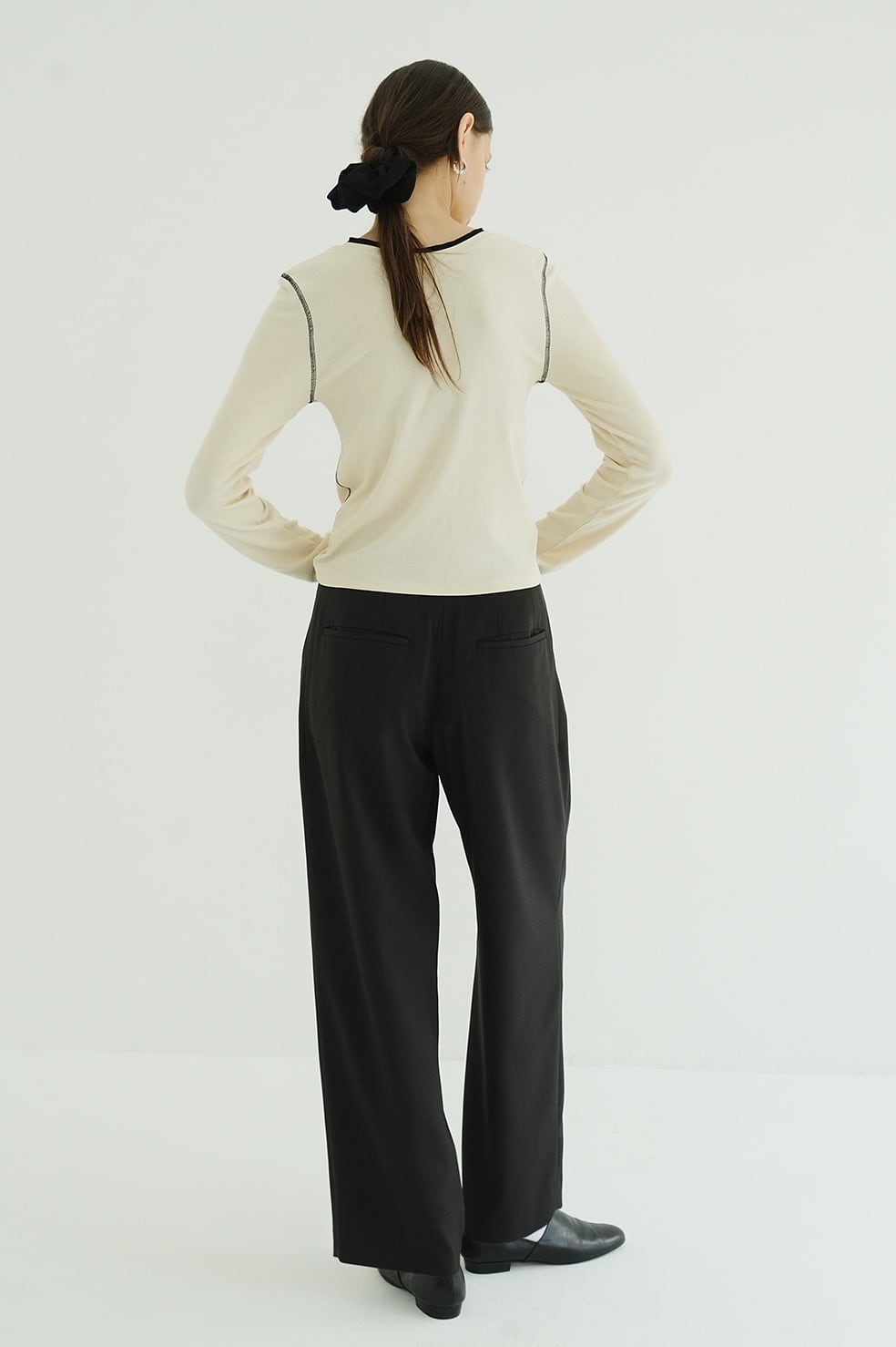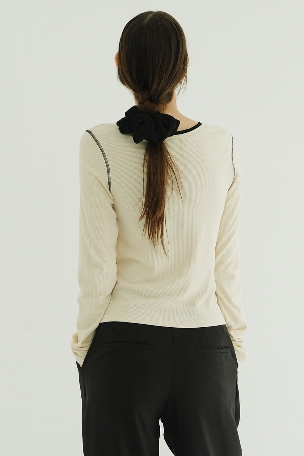 身頃には柔らかいリブ素材を使用し、配色部分には抜け感のある天竺素材を使用しました。襟ぐりや前たて、ボタンなどを配色にし、アームホールと脇線にはオーバーロック加工を施して一癖ある一枚に仕上げました。