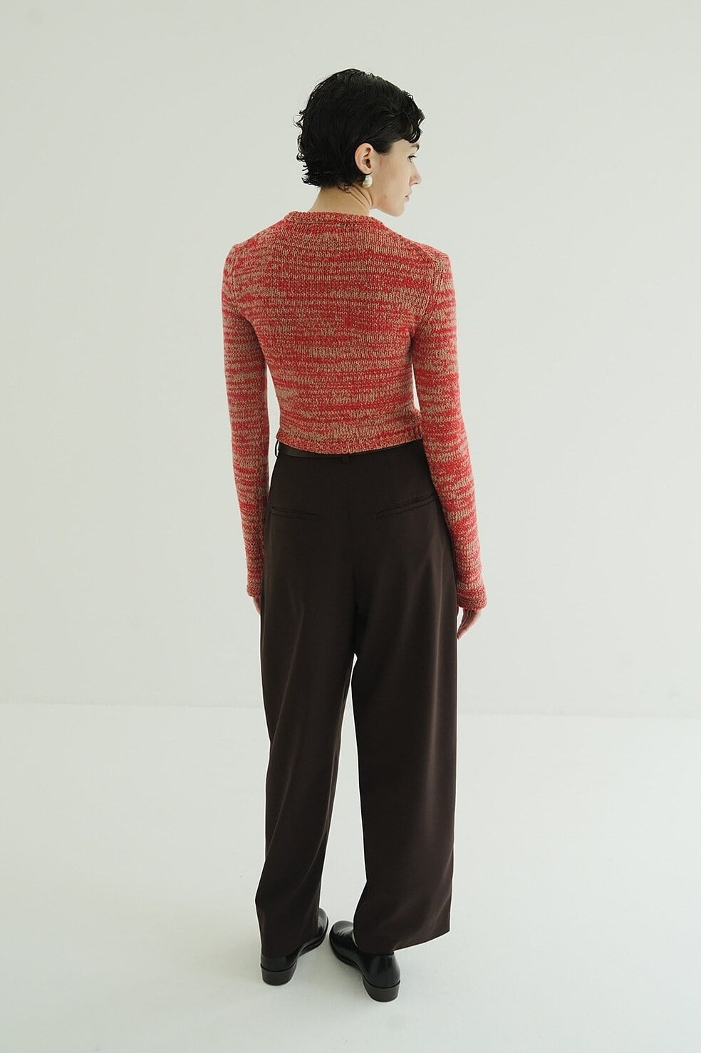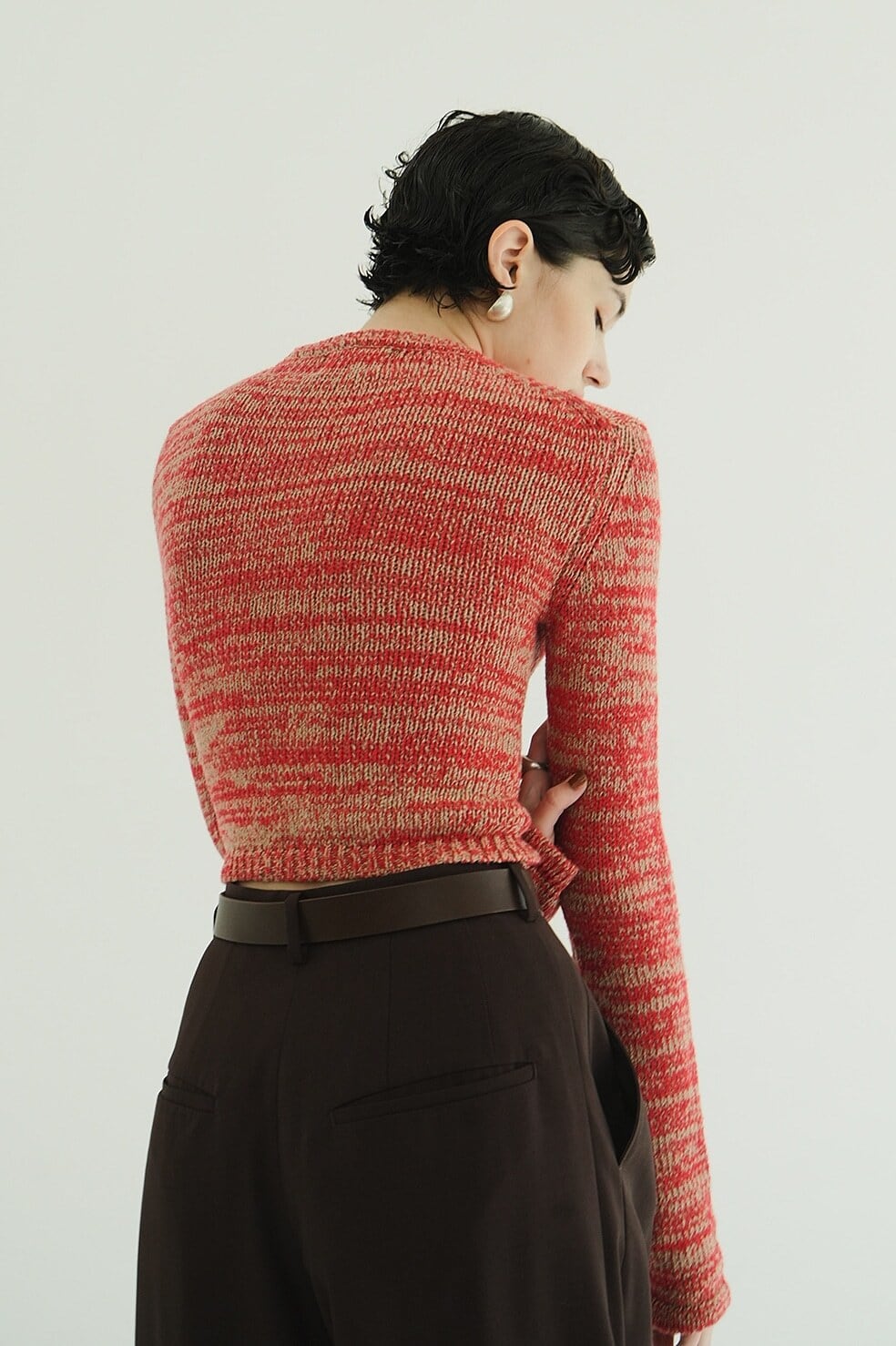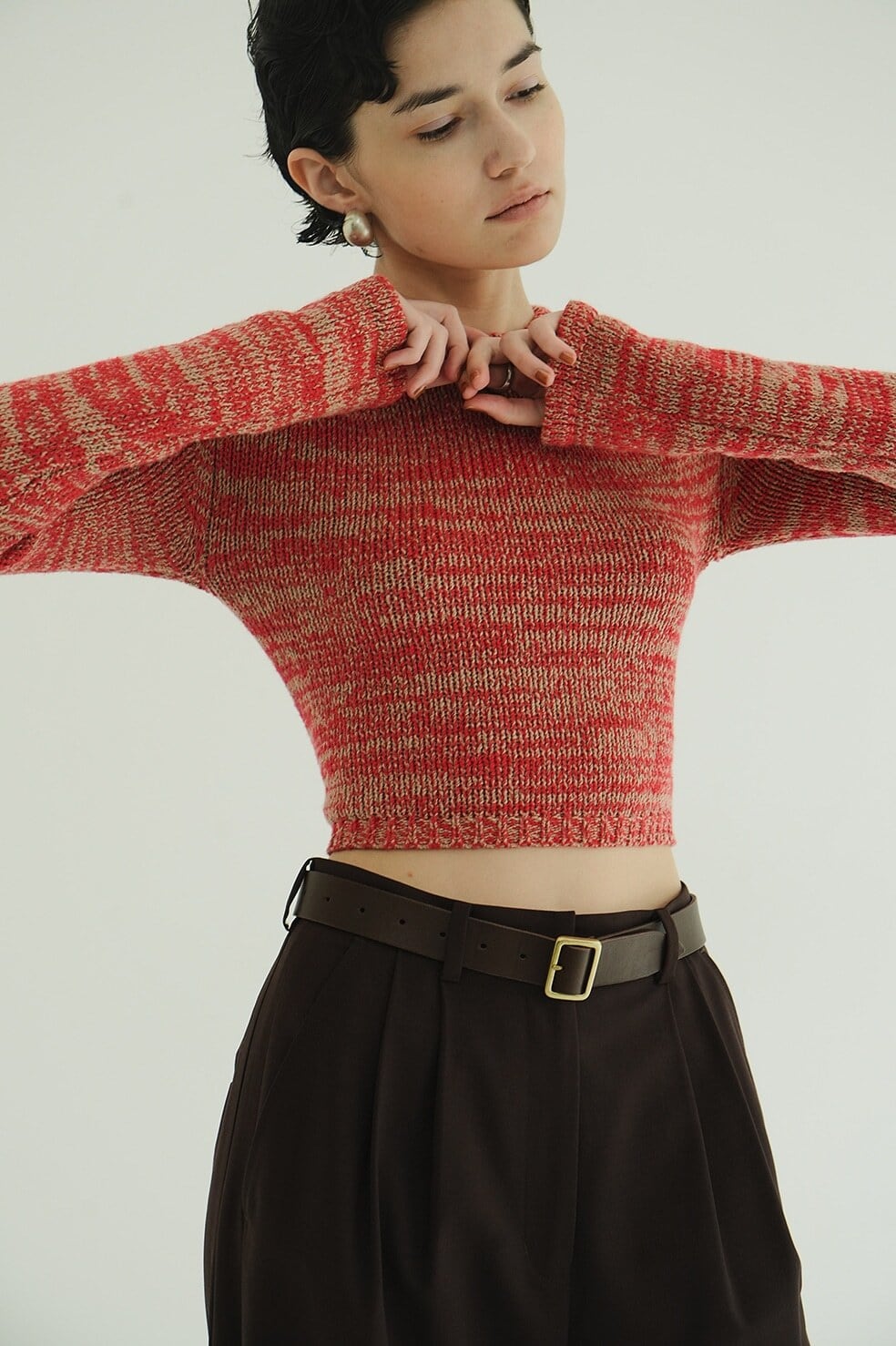 ミニブークレー風の糸でさりげない表情をプラスした、ややタイトフィットなニットトップス。