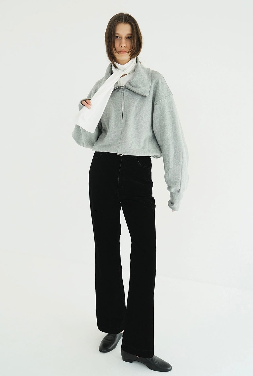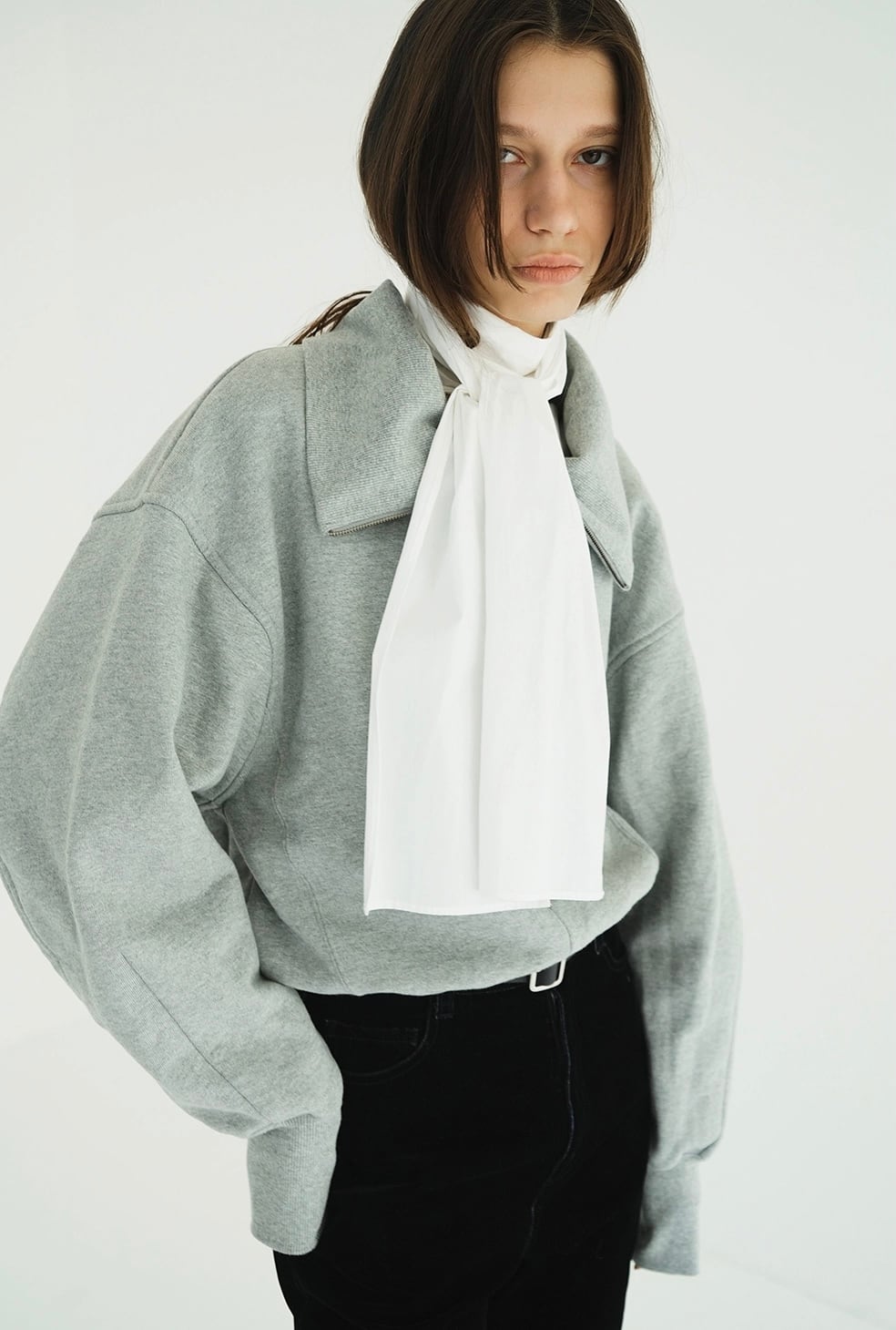 ファスナーを開けると大きめの襟が小顔効果を演出し、ショート丈でもバランスの取りやすいデザインです。