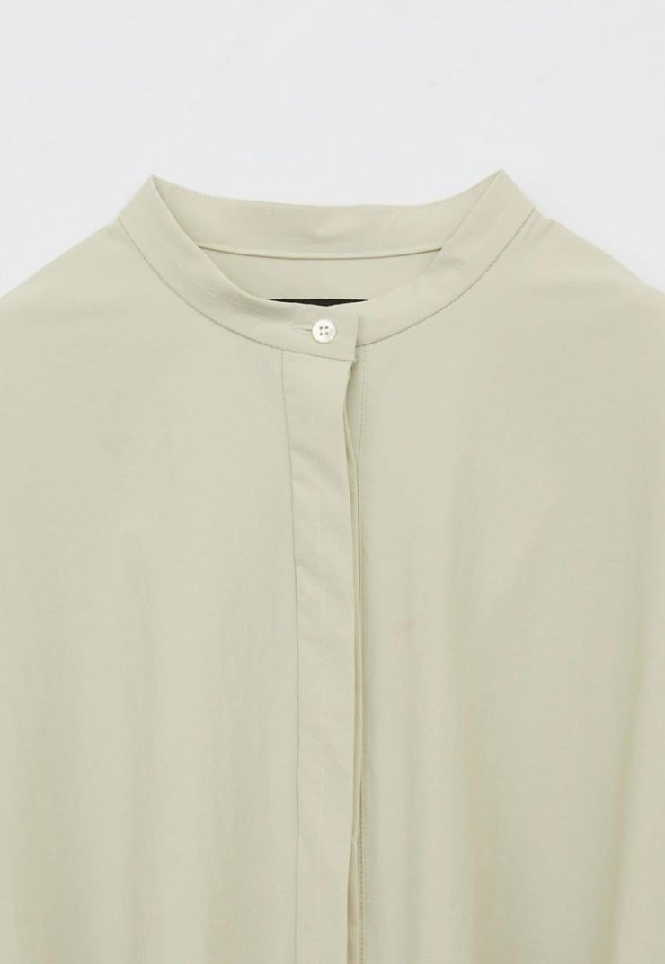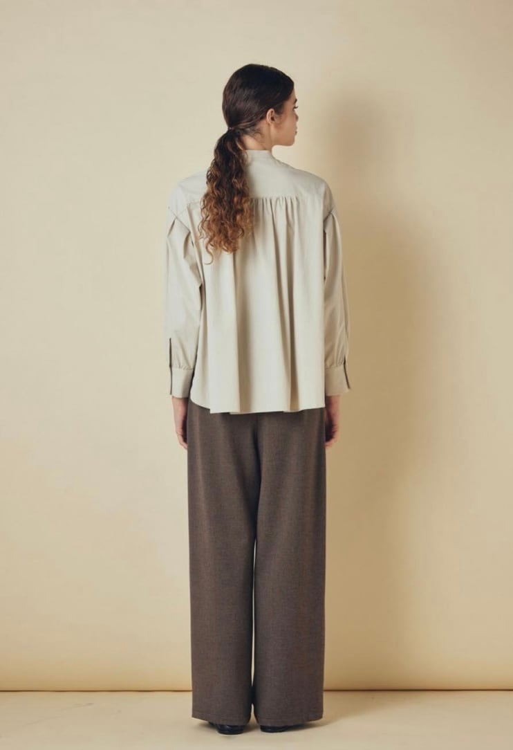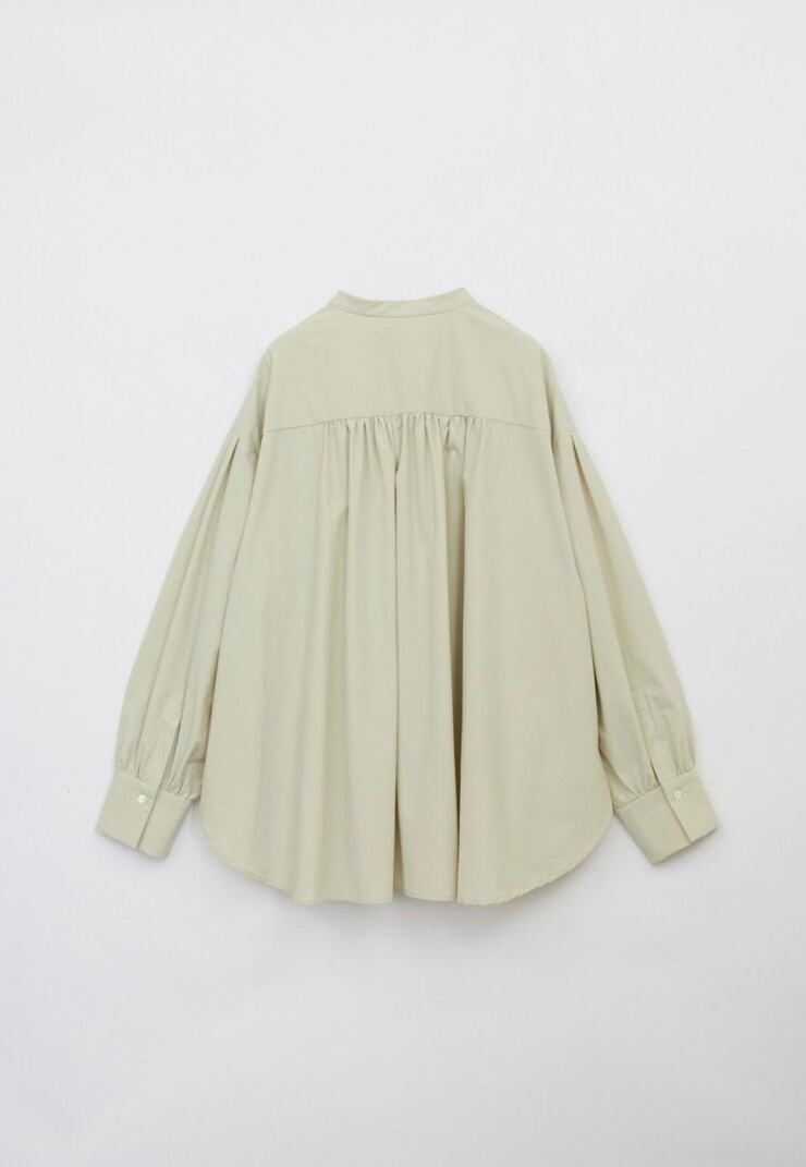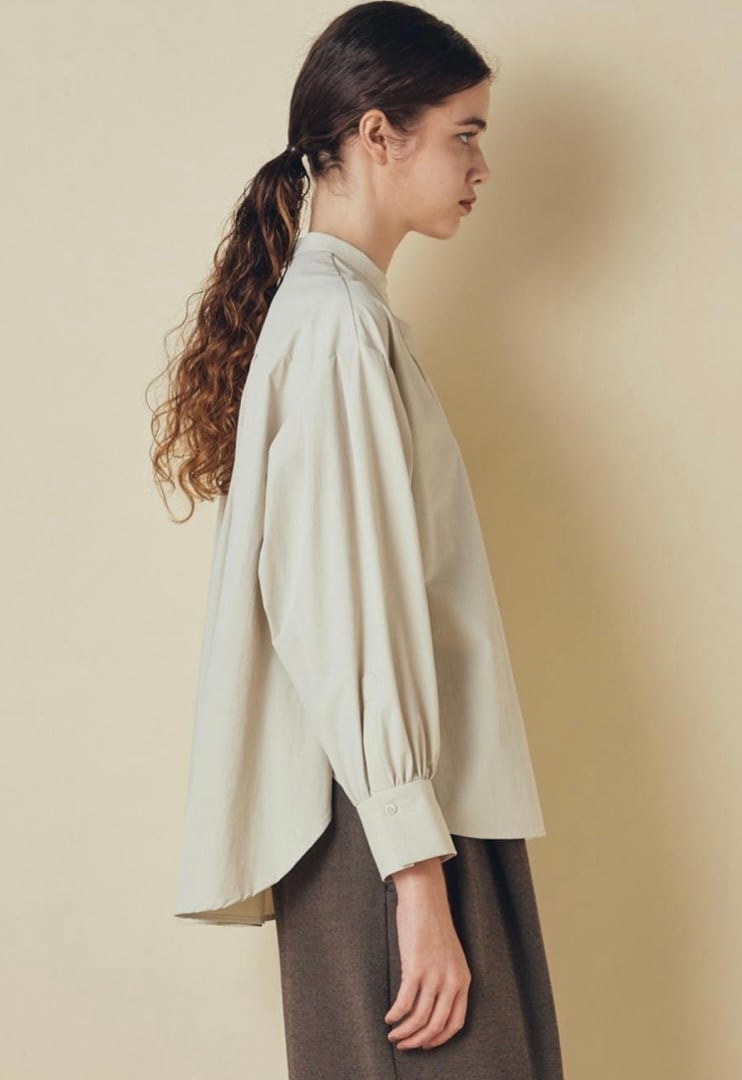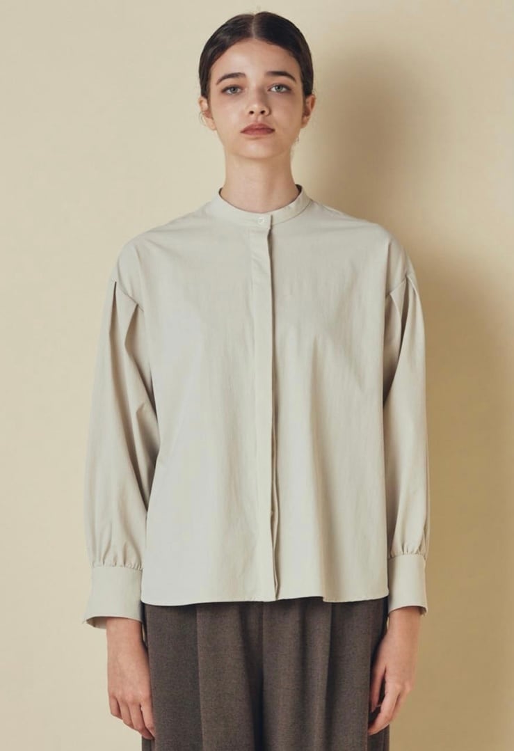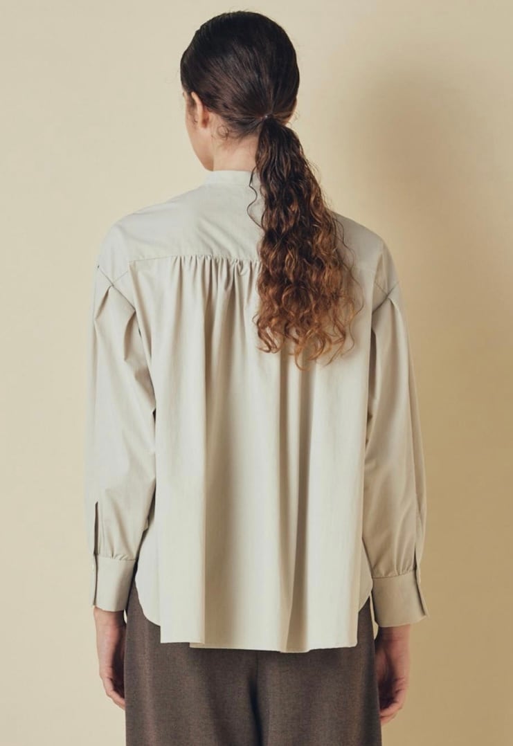 首元をすっきり見せてくれるバンドカラーが、ナチュラルながらもどこか上品な印象に仕上がるブラウスです。程よく艶感があり、軽さと表情感を兼ね備えた2WAYストレッチで、ヨコ糸にリサイクルナイロンを使用したサステナブルな素材です。バックスタイルや袖にはFLORENTらしいさりげなく華やかなギャザーが施されています。適度にゆとりのあるシルエットで体のラインを拾わず、きちんと感もキープ。オフィスからお出掛けまで、シーンを問わず着まわせる一枚です。クルーネックのニットなどと合わせたレイヤードにもおすすめ。