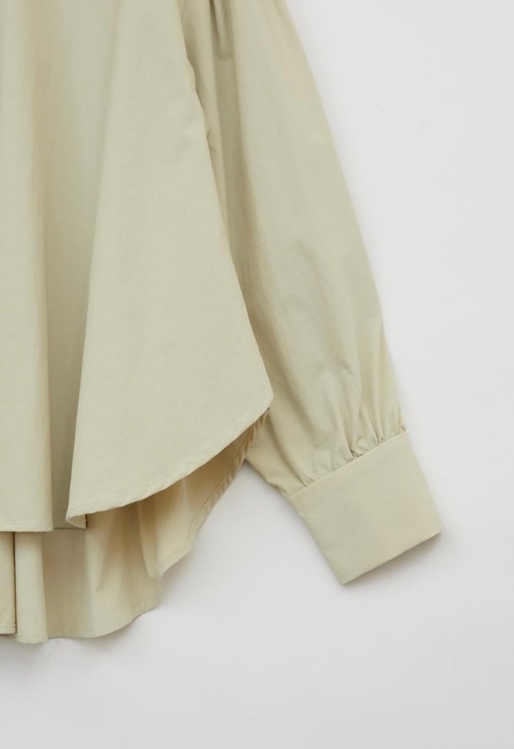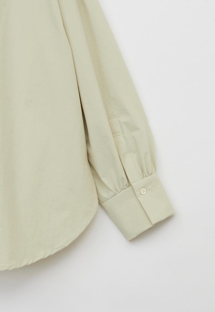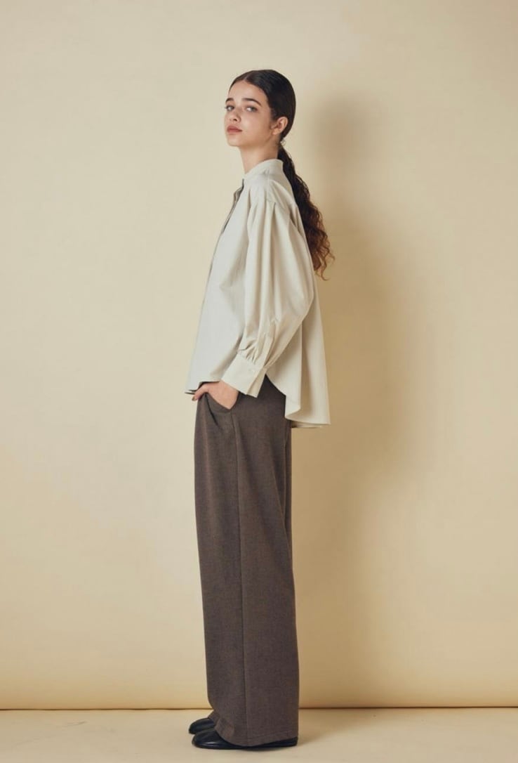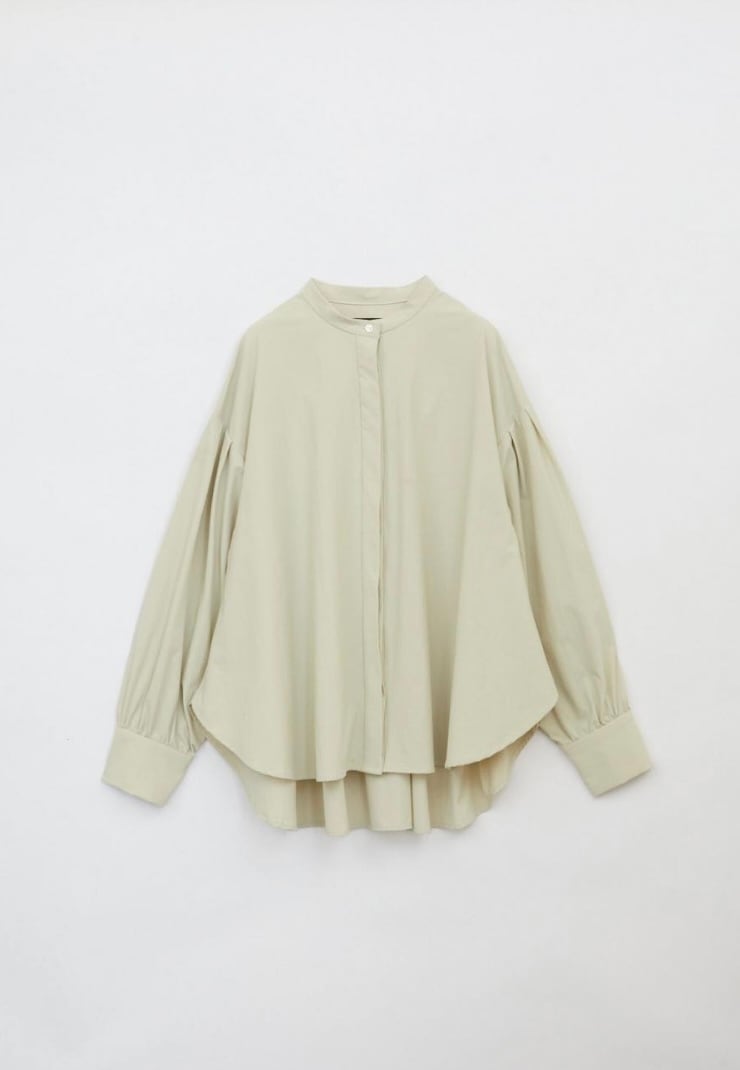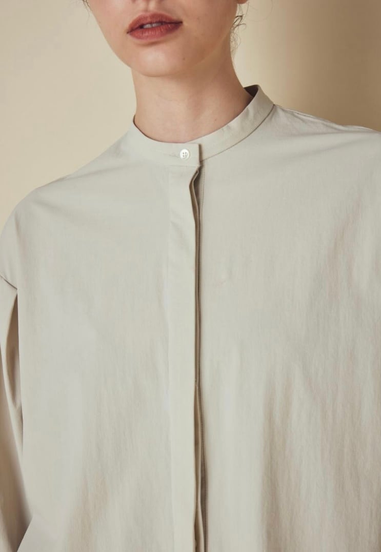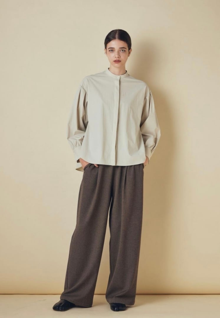 首元をすっきり見せてくれるバンドカラーが、ナチュラルながらもどこか上品な印象に仕上がるブラウスです。程よく艶感があり、軽さと表情感を兼ね備えた2WAYストレッチで、ヨコ糸にリサイクルナイロンを使用したサステナブルな素材です。バックスタイルや袖にはFLORENTらしいさりげなく華やかなギャザーが施されています。適度にゆとりのあるシルエットで体のラインを拾わず、きちんと感もキープ。オフィスからお出掛けまで、シーンを問わず着まわせる一枚です。クルーネックのニットなどと合わせたレイヤードにもおすすめ。