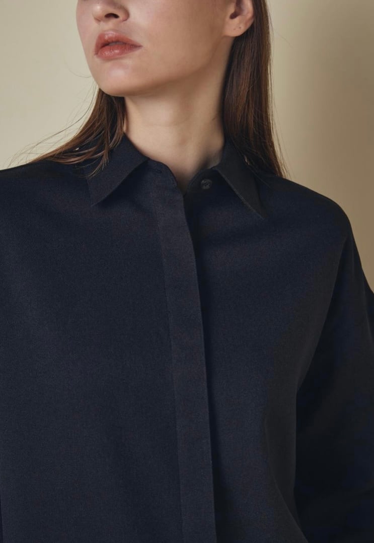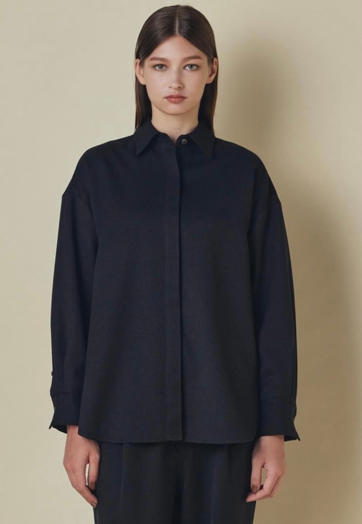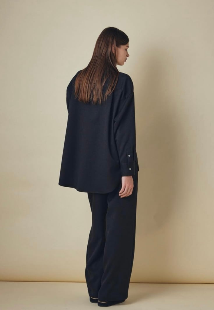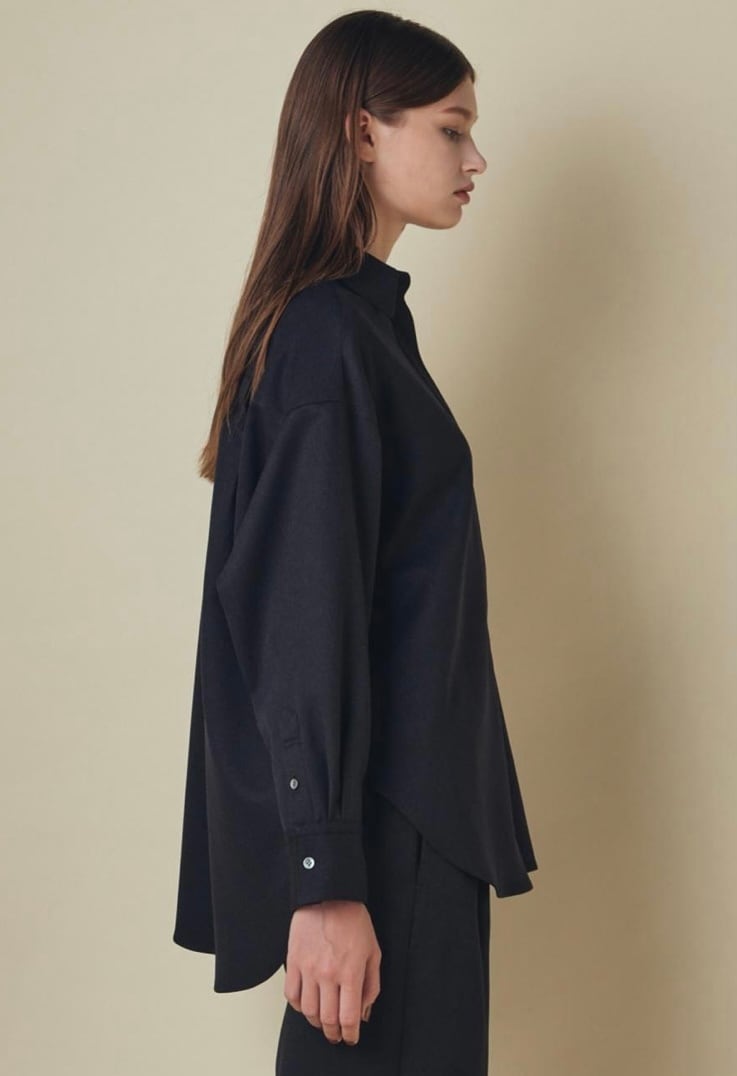 トラッドなムードを感じさせるメンズライクなデザインながら、シルエットやディテールに女性らしさが漂うシャツブラウス。取り扱いがしやすいポリエステル素材ですが、ウールのような温かみのある風合いが特徴で、季節感のあるコーディネートに仕上がります。同素材のワイドパンツとのセットアップスタイルは、程よくゆとりのあるシルエットにより抜け感のあるクールなスタイリングが完成。様々なコーディネートにフィットする頼れる一枚です。