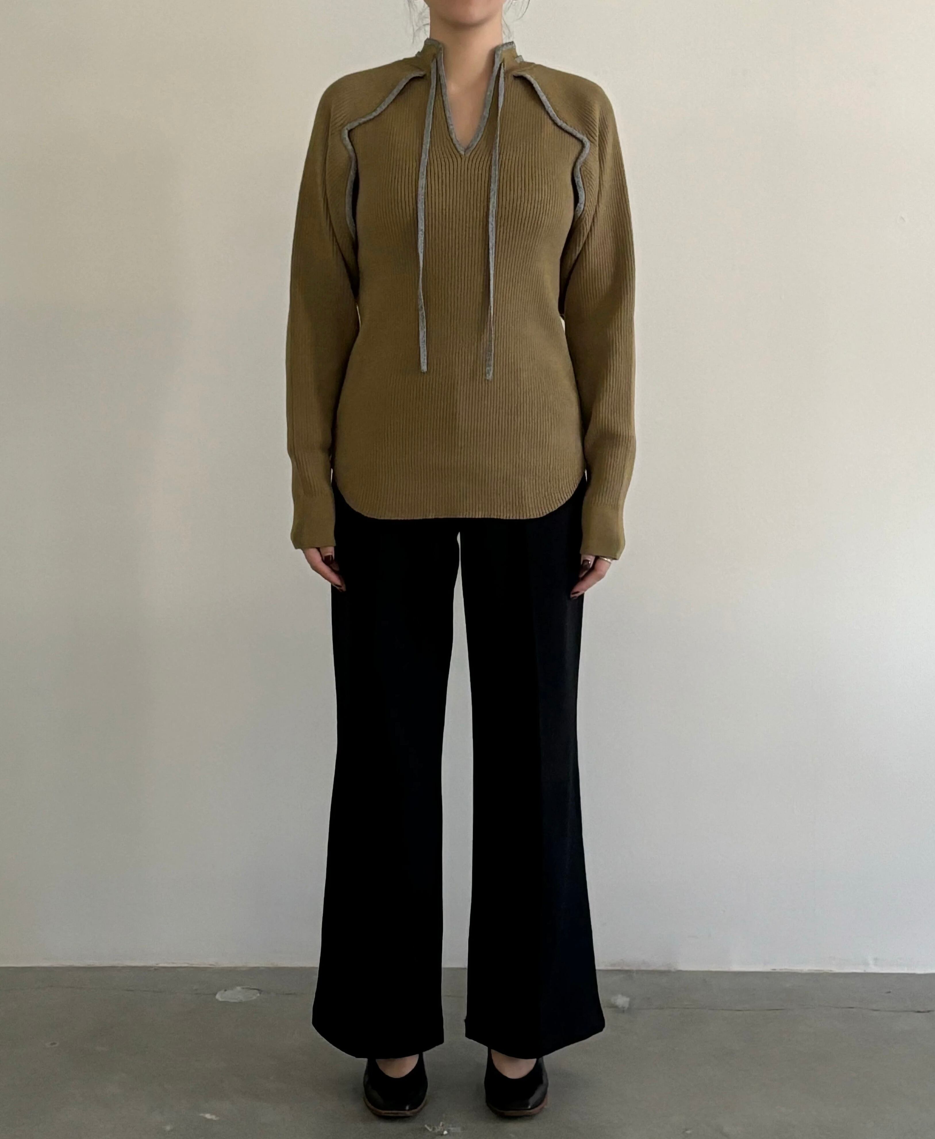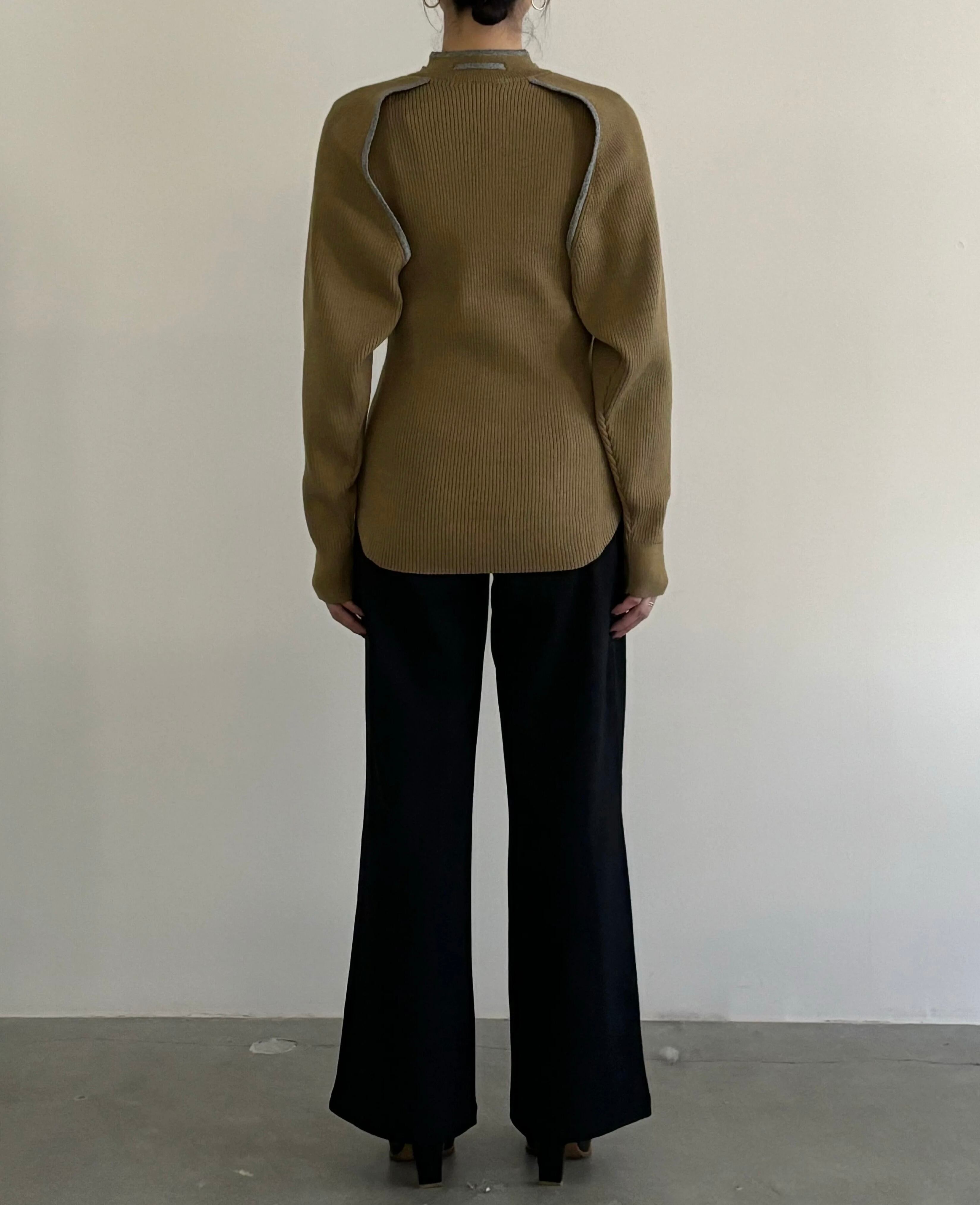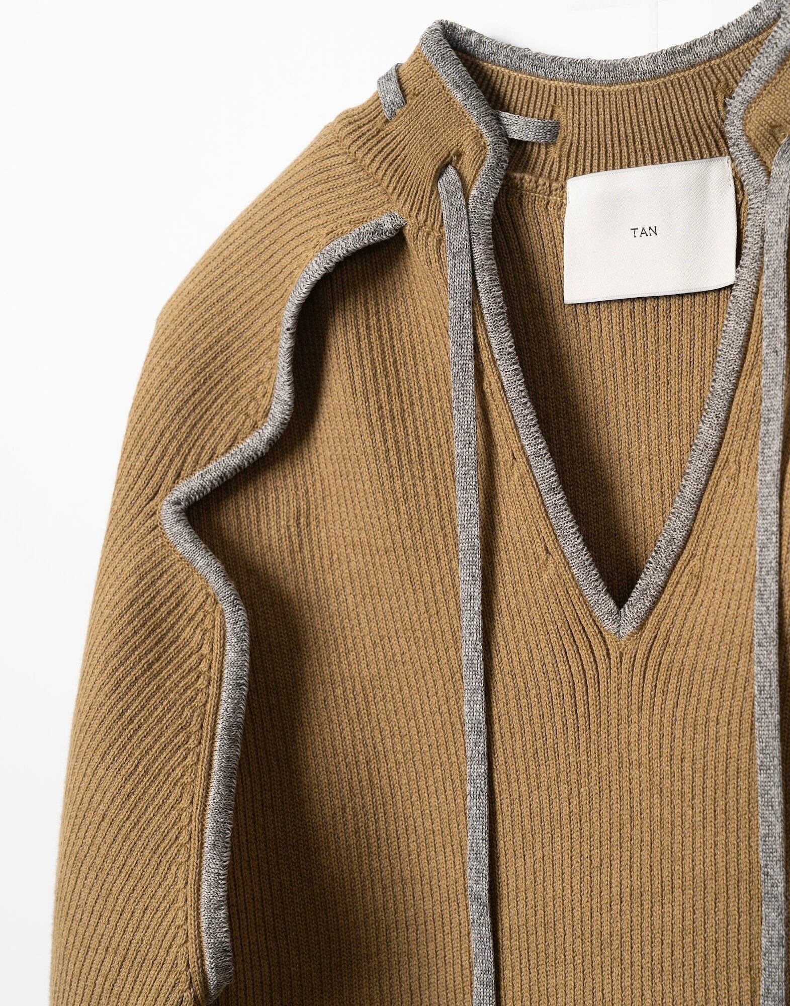 しなやかなコットンカシミヤをリブで編み、Vネックとオープンスリーブのデザインが重くならずシンプルでありながらも特別感のある一着。