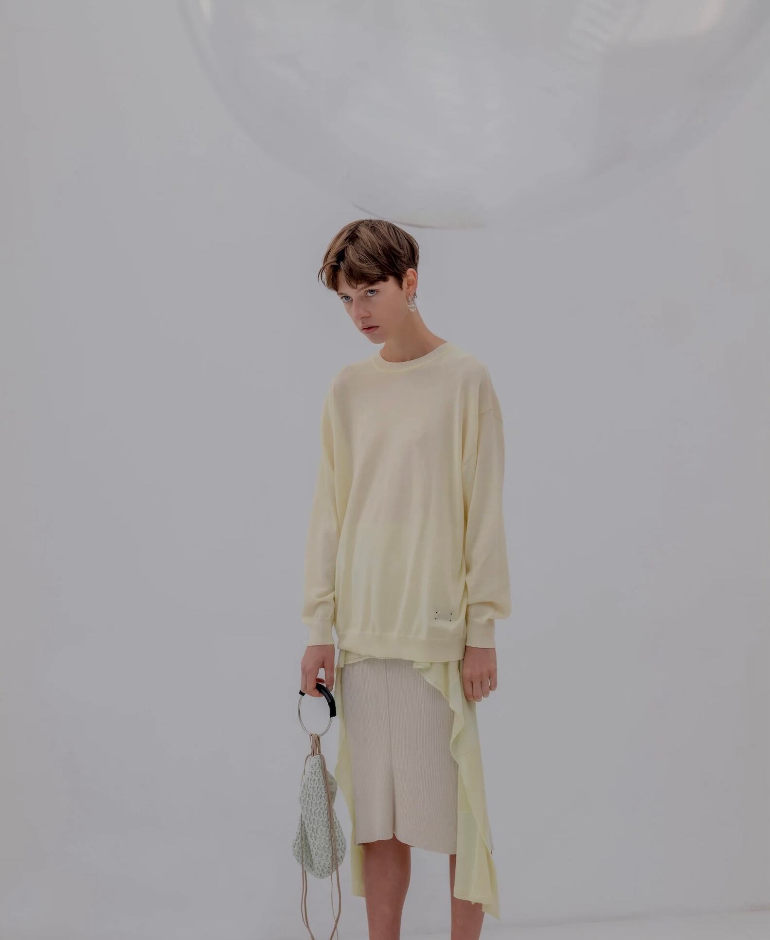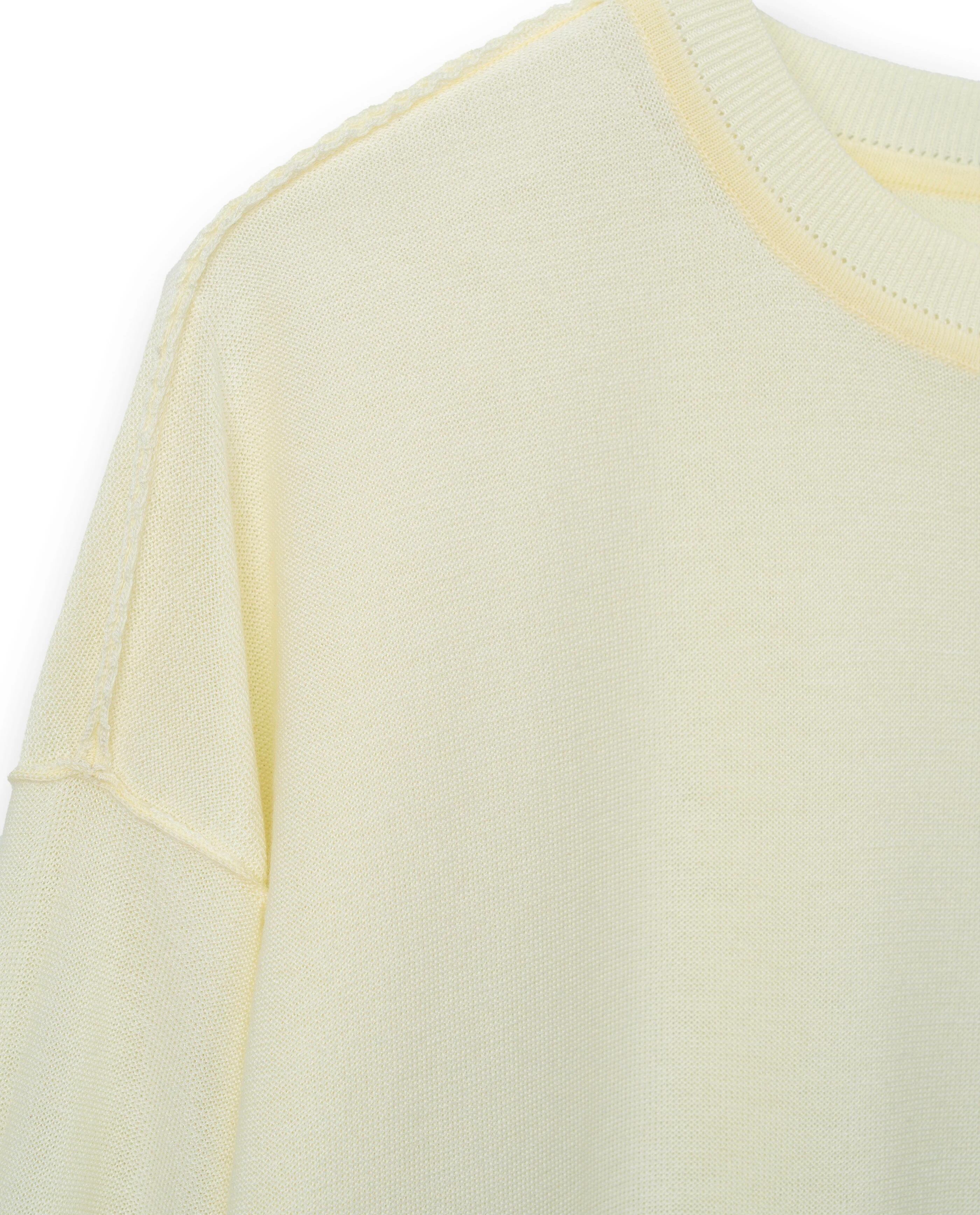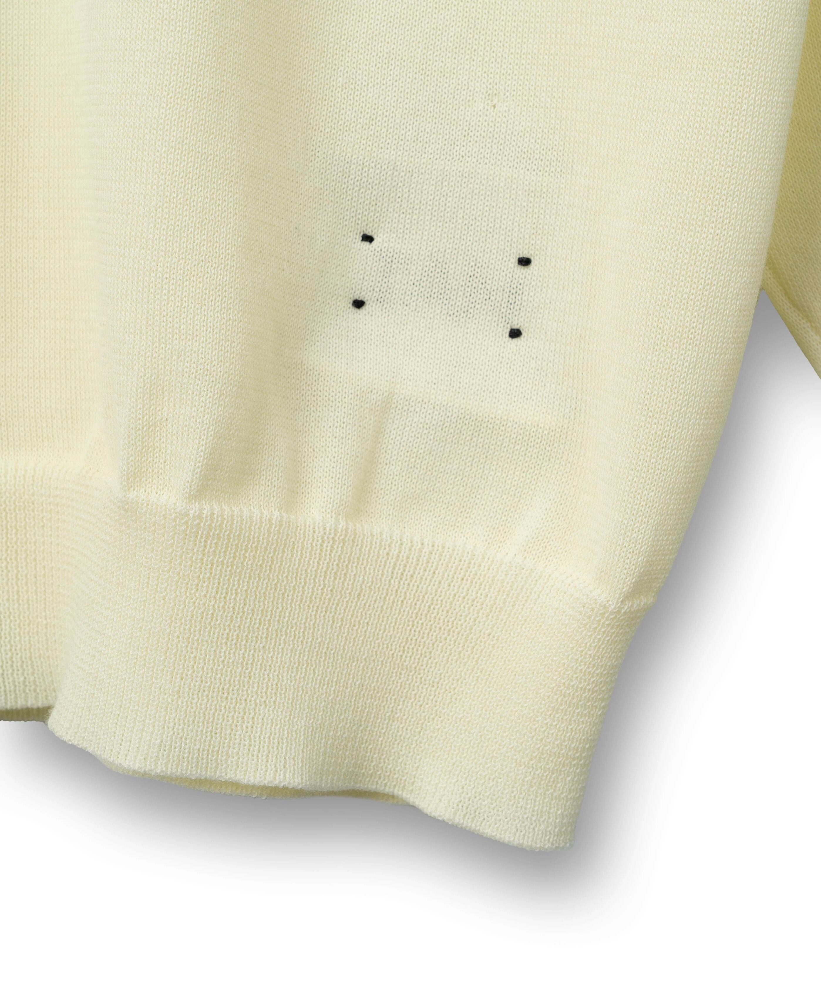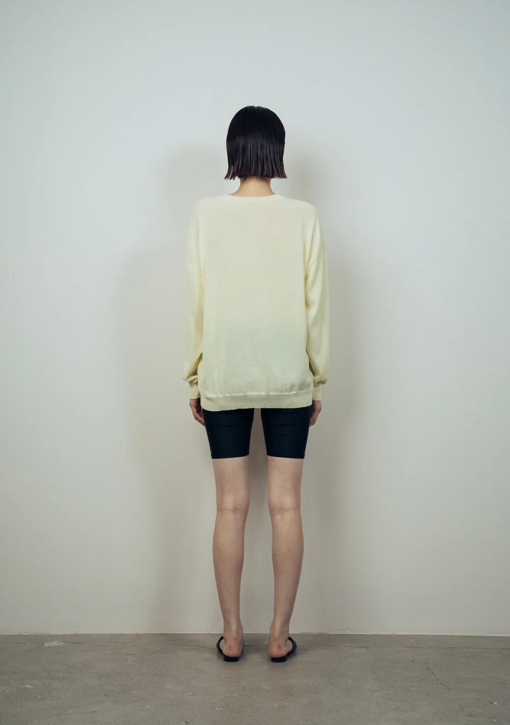 リバーシブル仕様のリラックスサイズプルオーバー。 表側では、ニットネームのTANロゴがほんのり透けて見えるデザイン。 プレーティング技法を用いて、素材も色も異なる糸を表裏で編み分けることで、リバーシブルでの着用を実現。