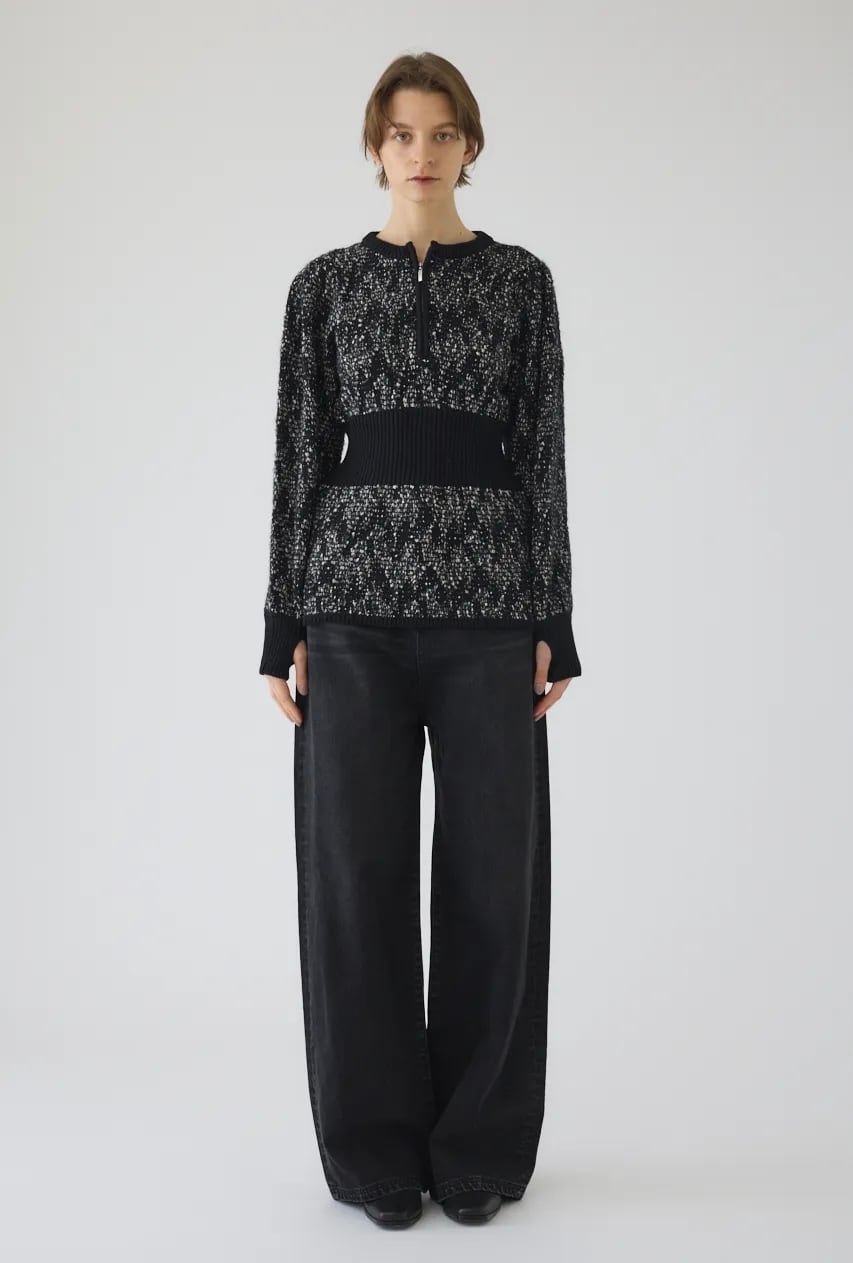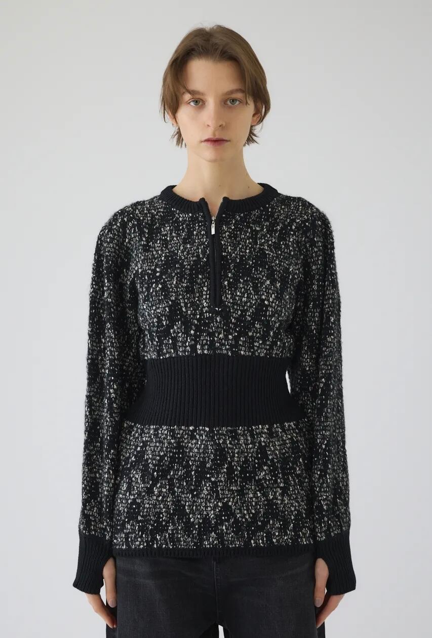 ジャガード編みの濃淡が織りなす奥行きのある表情と、ウエストマークデザインが着こなしに個性をプラスします。フロントのファスナーでネックのアレンジも可能です。