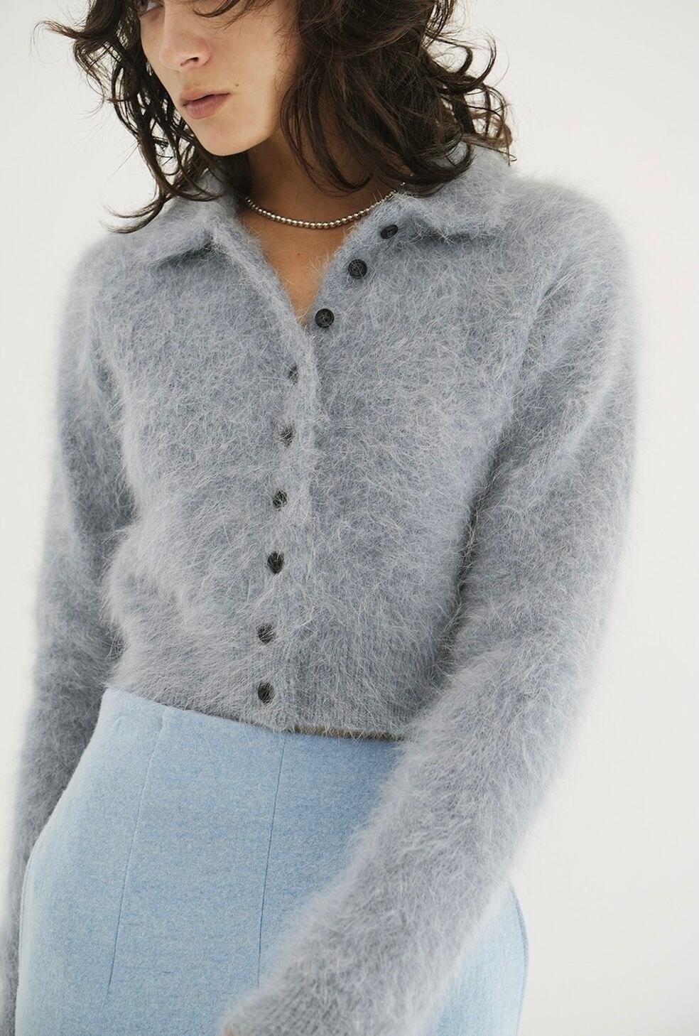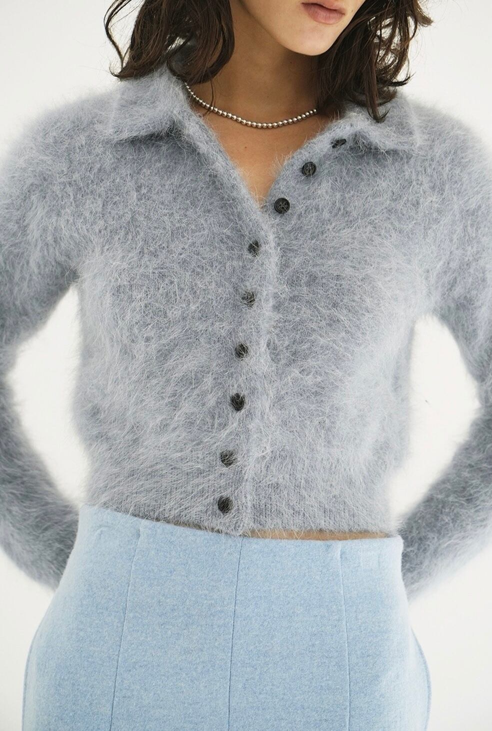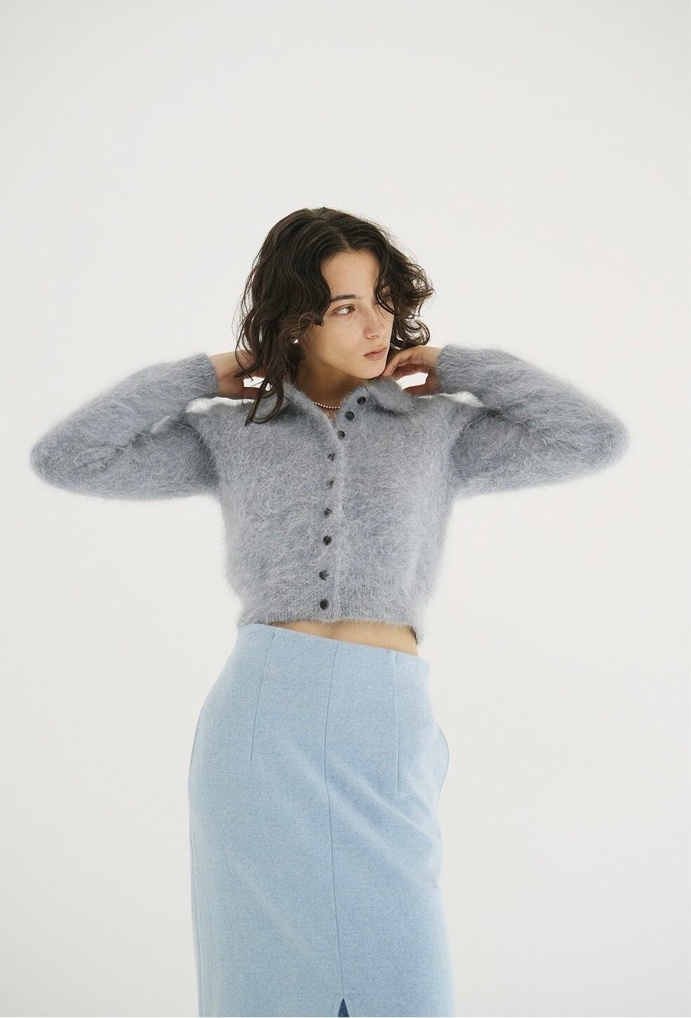 アンゴラ特有の毛足のある編み地に、襟元のバランスやボタン使いで甘くなりすぎないようデザインしました。袖はやや長めに、着丈は短めに設定し、全体をコンパクトなサイズ感に。