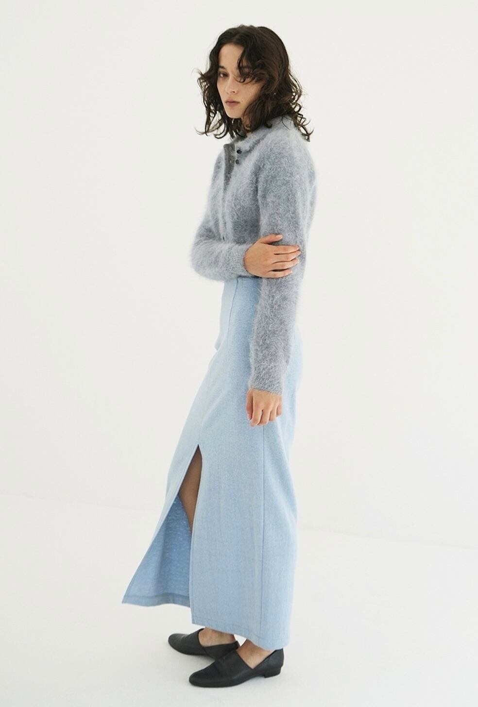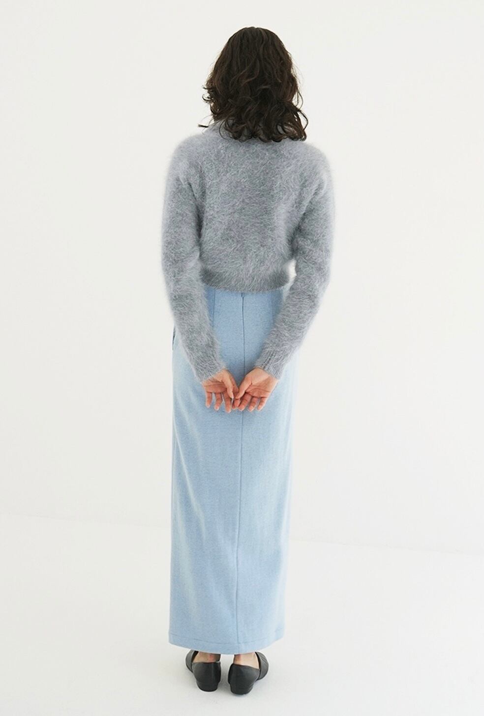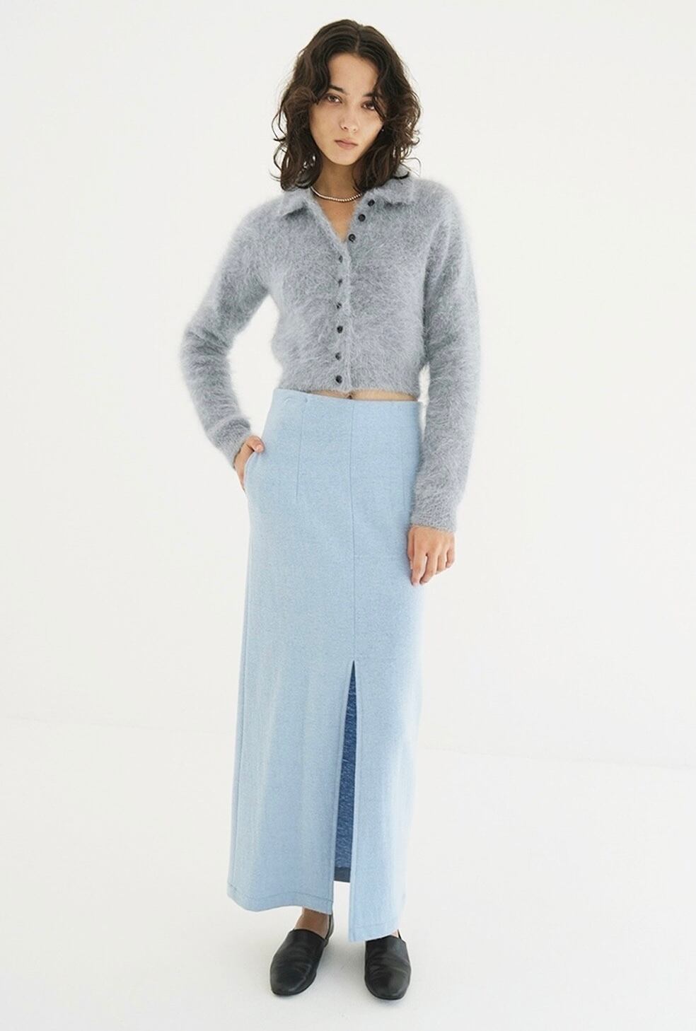 アンゴラ特有の毛足のある編み地に、襟元のバランスやボタン使いで甘くなりすぎないようデザインしました。袖はやや長めに、着丈は短めに設定し、全体をコンパクトなサイズ感に。