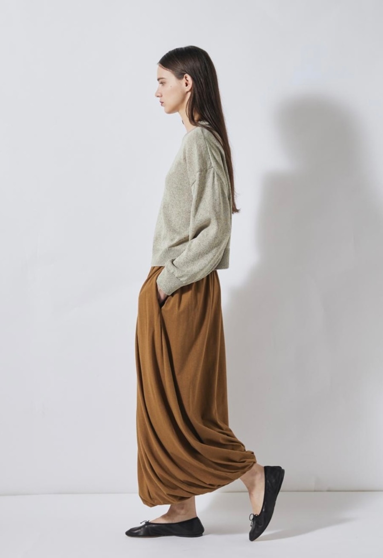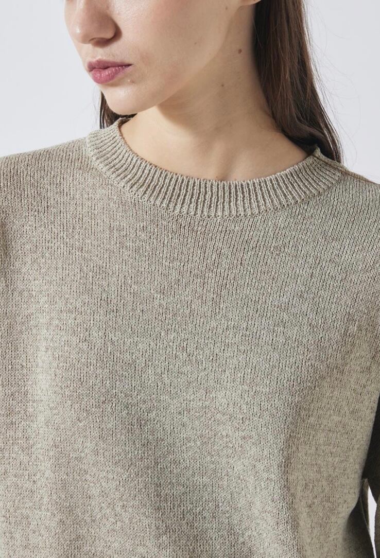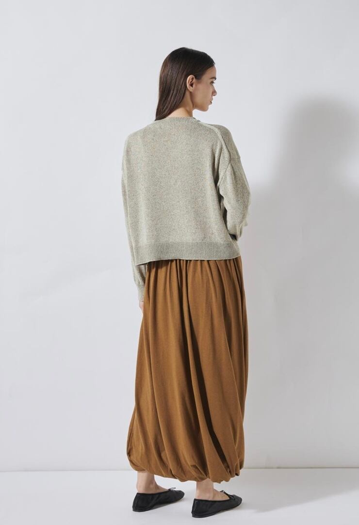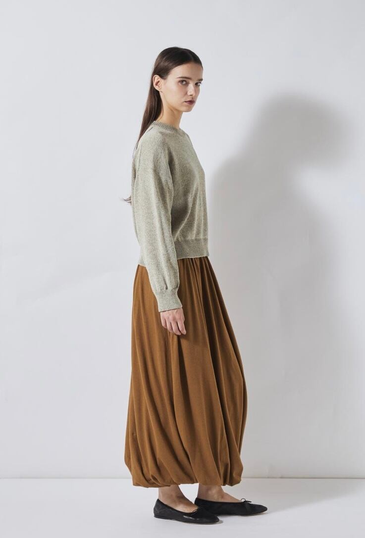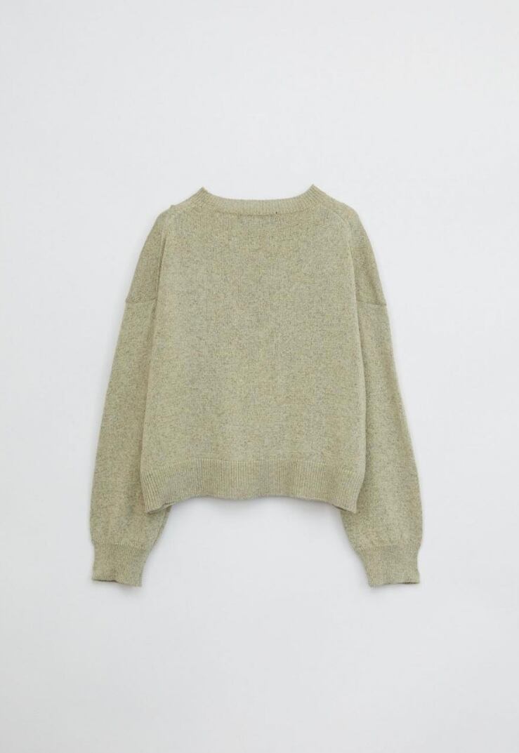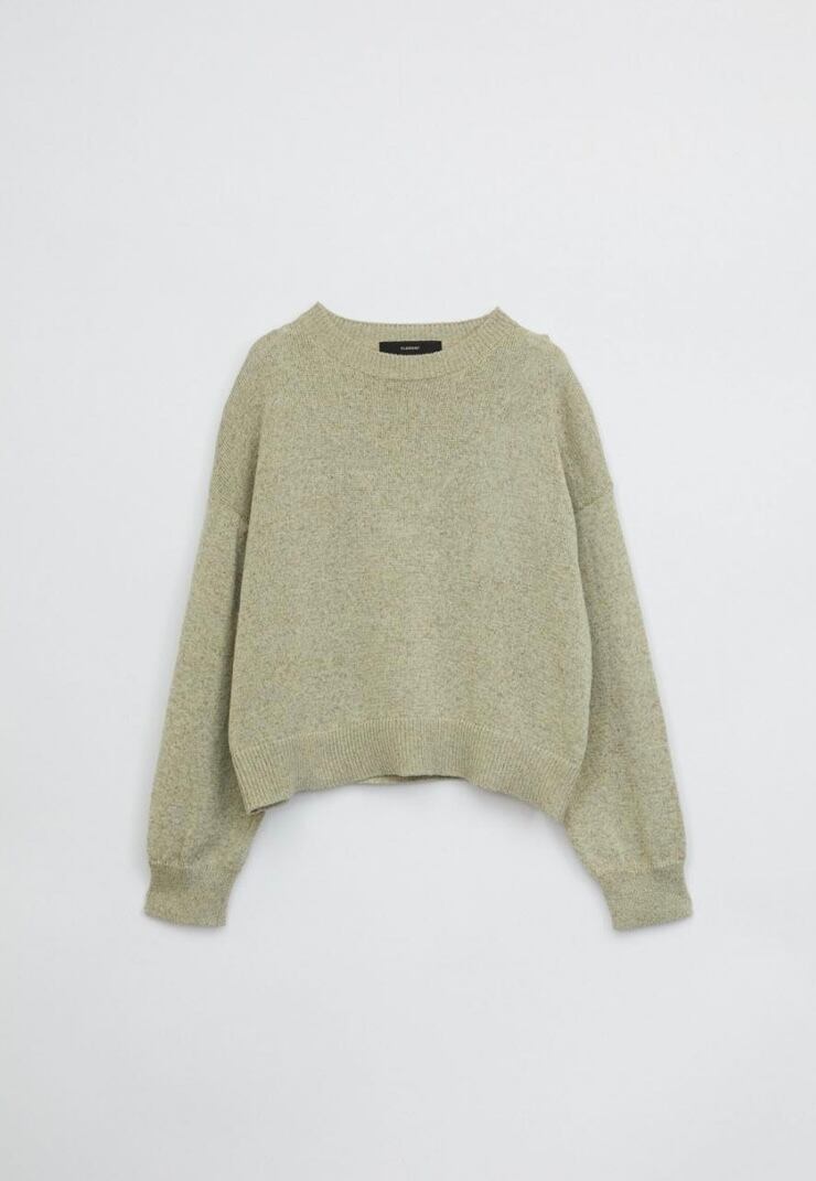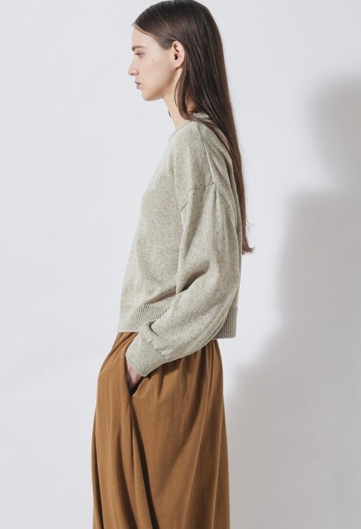 清涼感のあるドライなタッチのリサイクルポリエステルを使用したマーブルニット。コンパクトなボディと存在感のあるふんわりとしたスリーブの組み合わせで新鮮なバランスに仕上げました。やや短めの着丈でスリムにはもちろん、ボリュームのあるボトムスとも好相性。軽やかかつニュアンス感のあるスタイリングが決まる、春にぴったりのアイテムです。ミニマルなデザインながらどこかこなれた印象で、一枚でさまになるアイテムです。