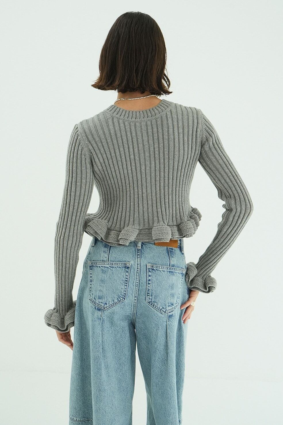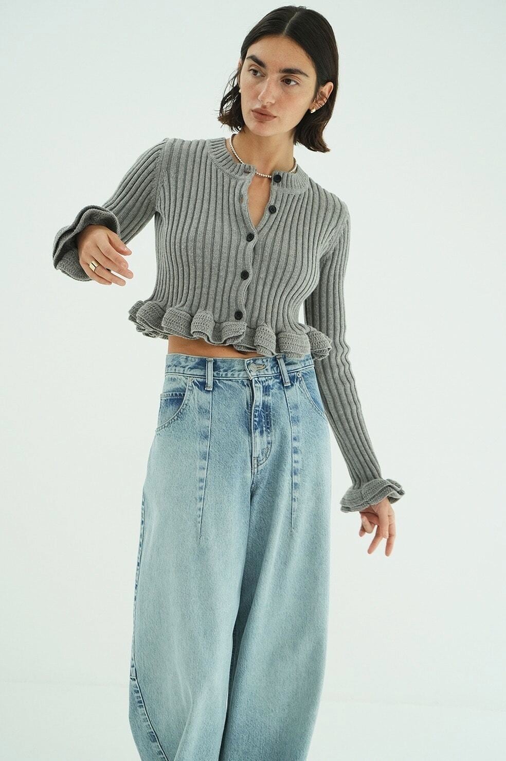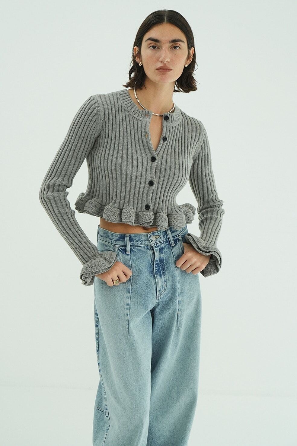編み地はワイドリブで編み立て、フリルの甘さをカジュアルに引き締めました。