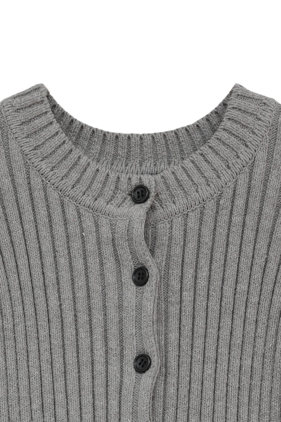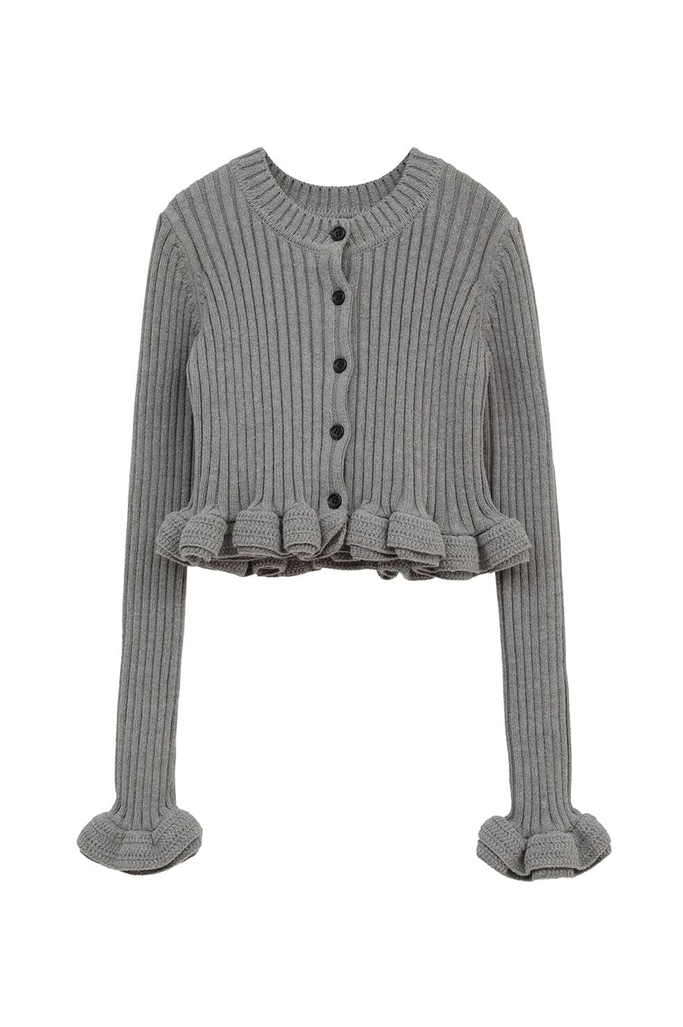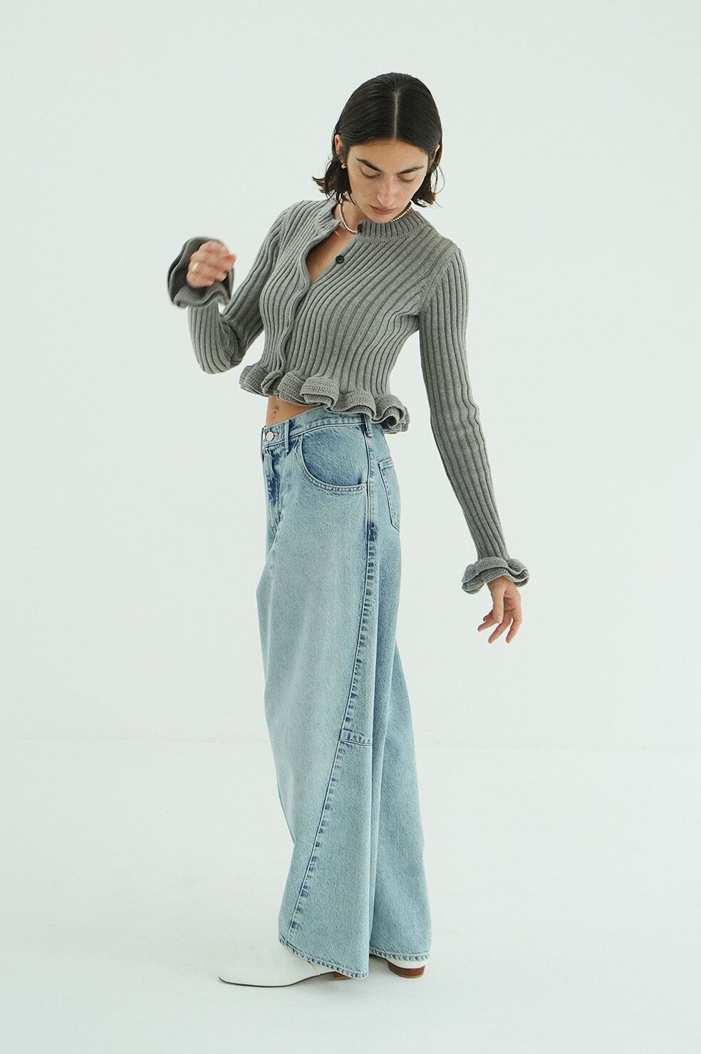 編み地はワイドリブで編み立て、フリルの甘さをカジュアルに引き締めました。
