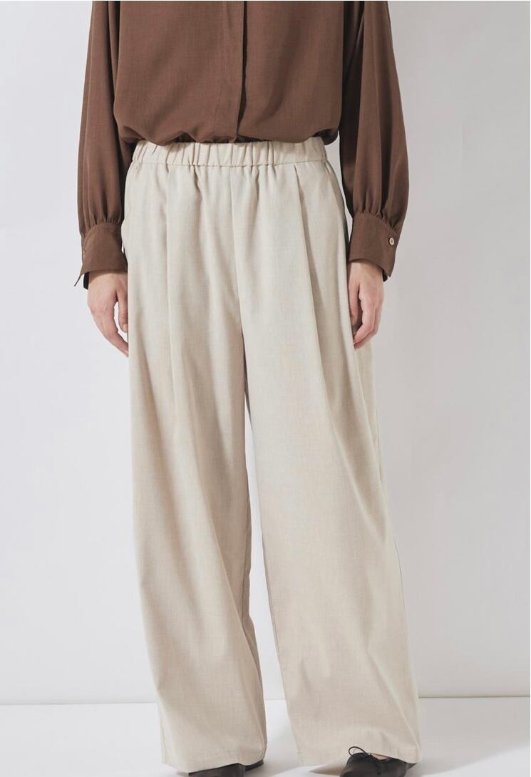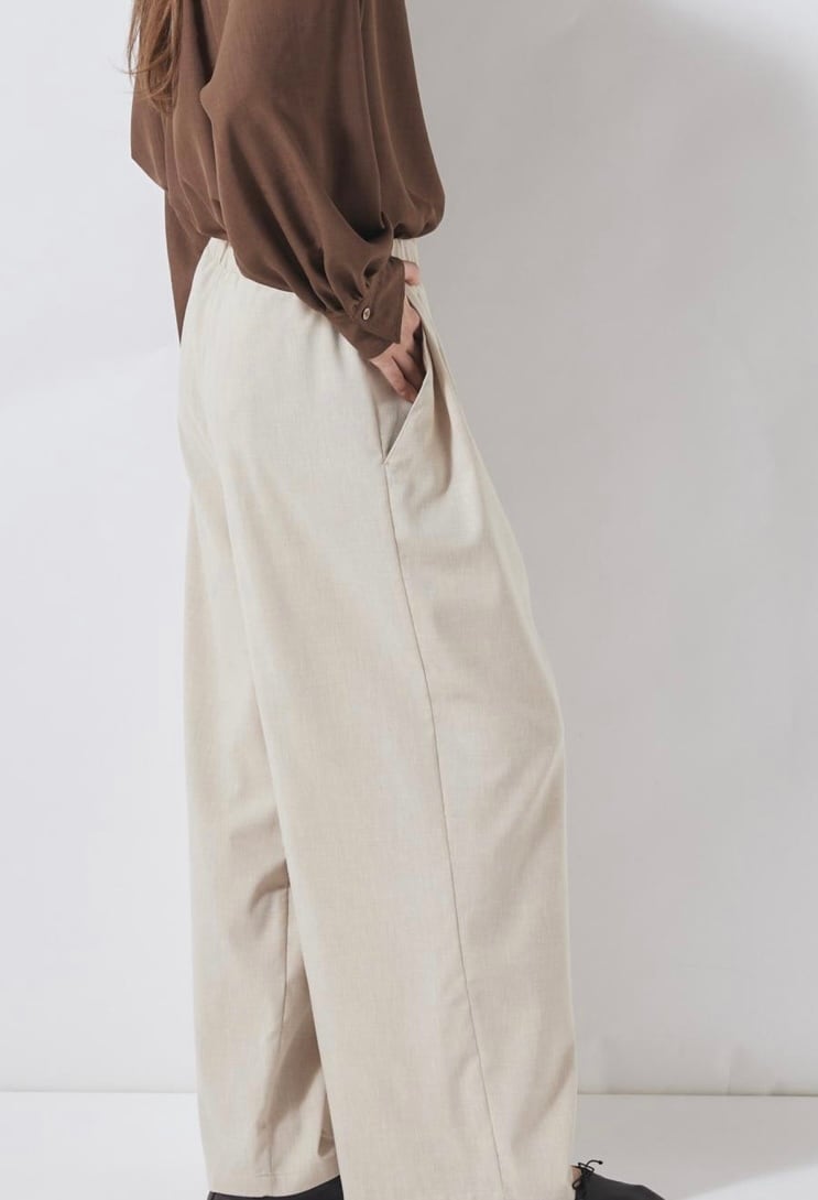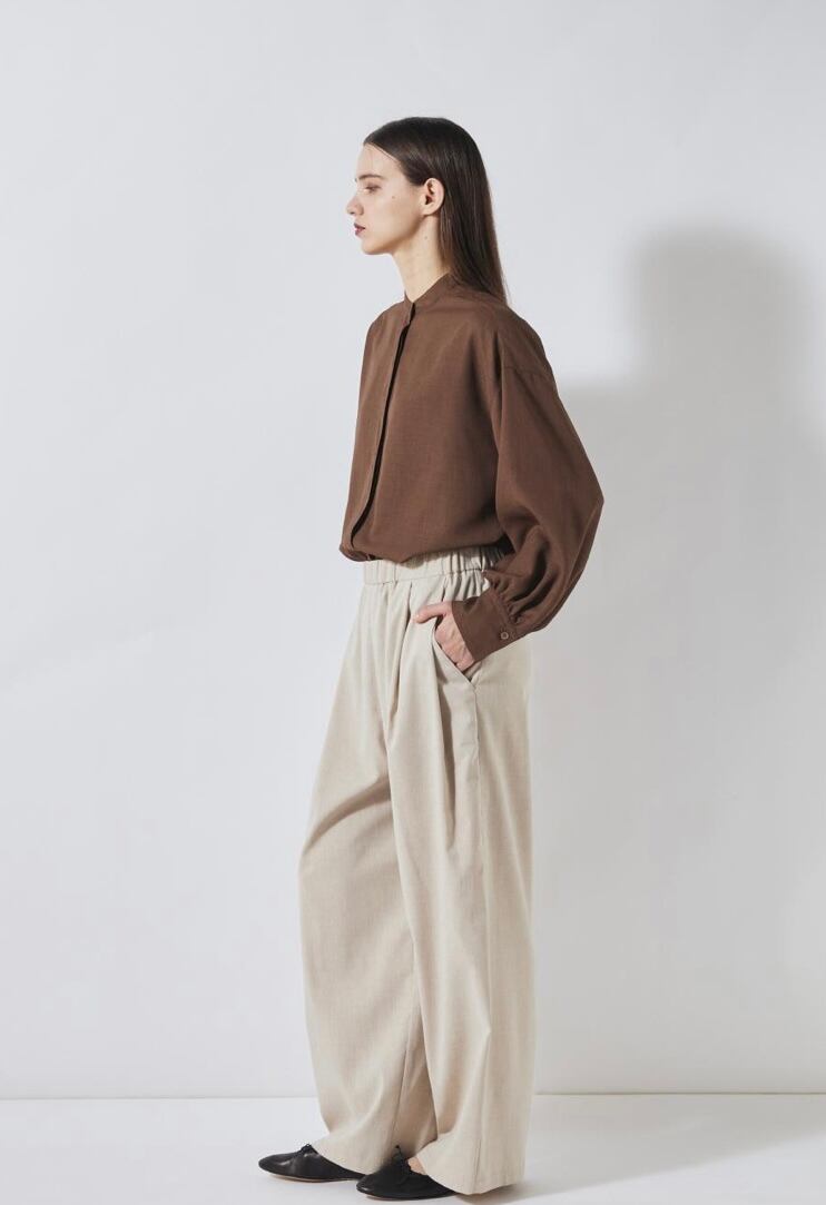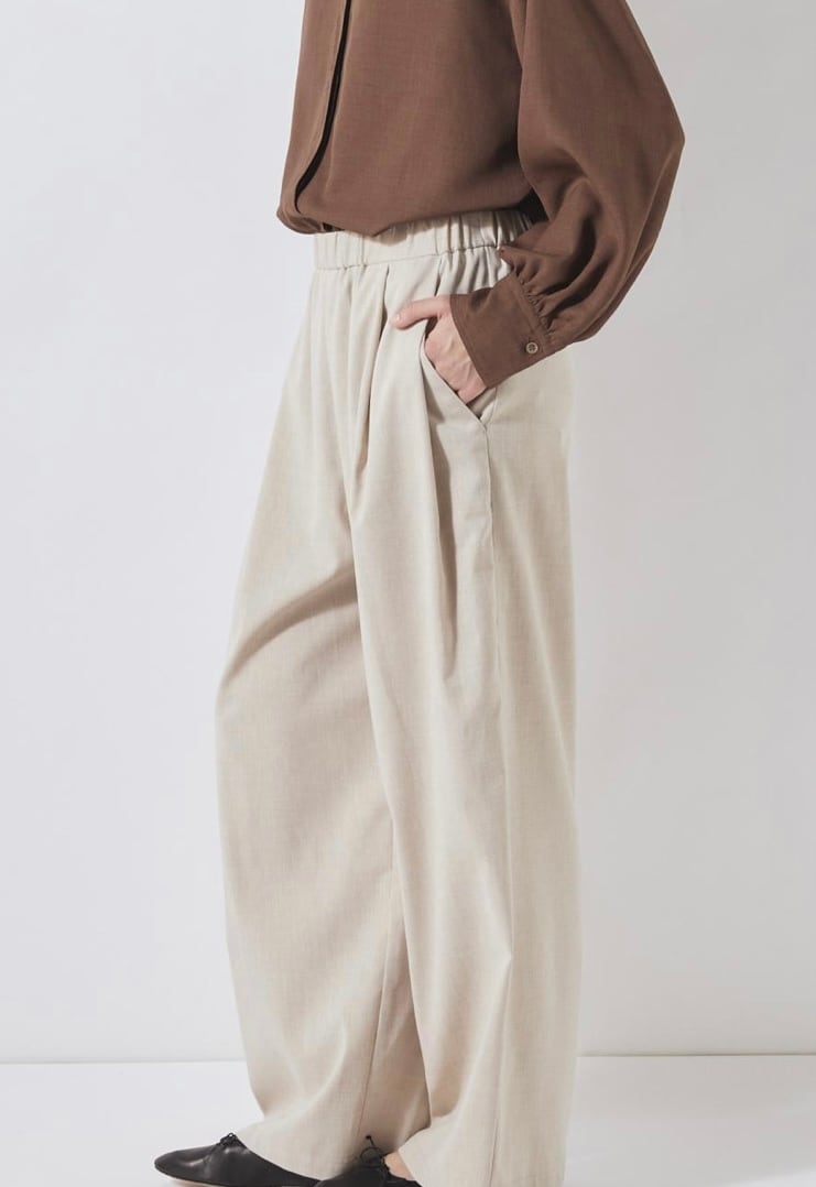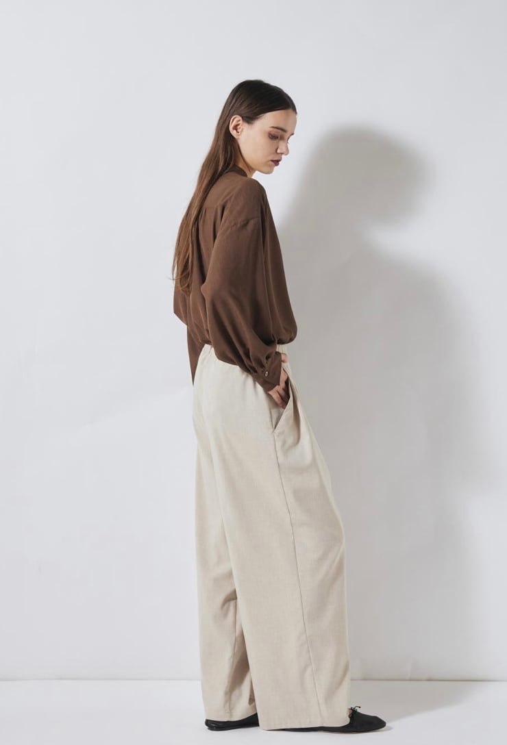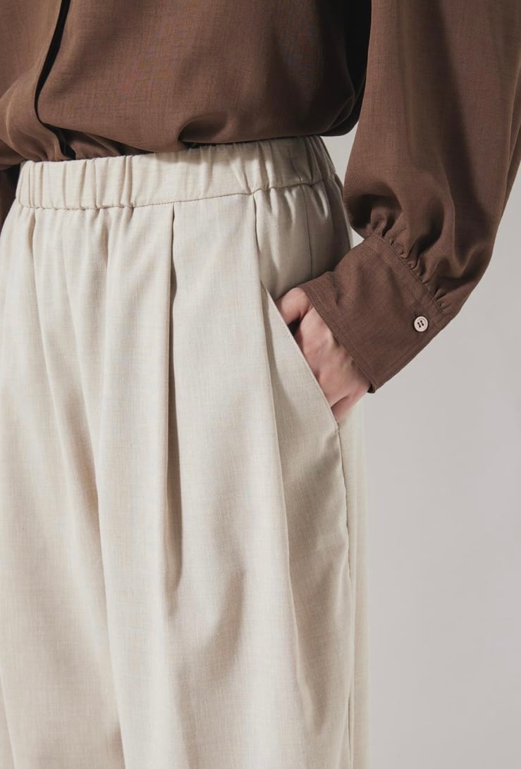 ベーシックで流行りにとらわれないたっぷりとしたワイドなシルエットで履き心地はサラリと軽く、ウエストはワンタックの総ゴムでラフな印象ながらもどこかリュクスなムード漂うアイテムです。ディティールがシンプルなのでトップスを選ばずデイリー使いに最適。麻をブレンドすることにより清涼感のあるシャンブレー素材は柔らかく程良いドレープ性と光沢感が美しいパンツです。同素材のブラウスとセットアップの着こなしもおすすめです。