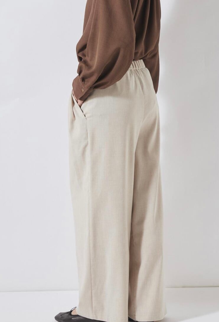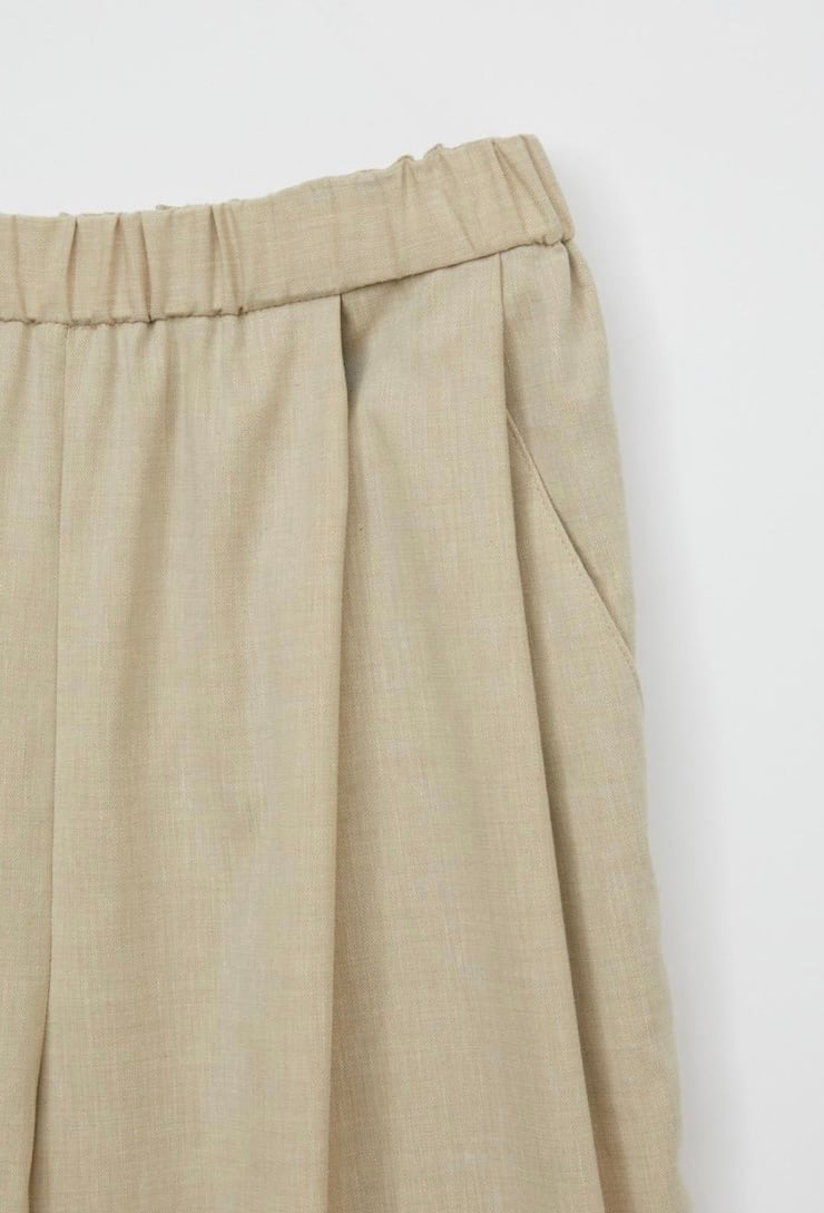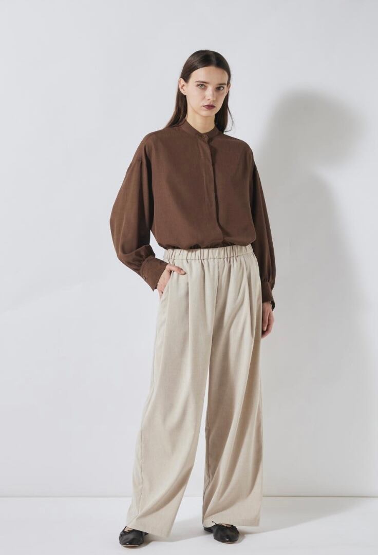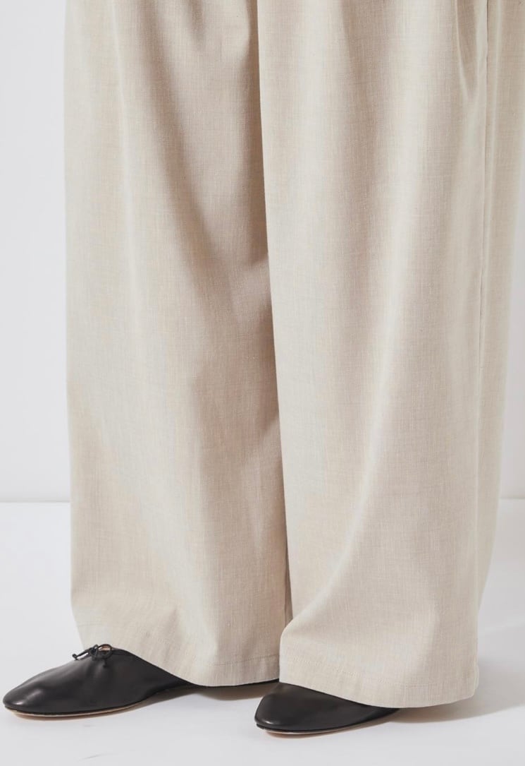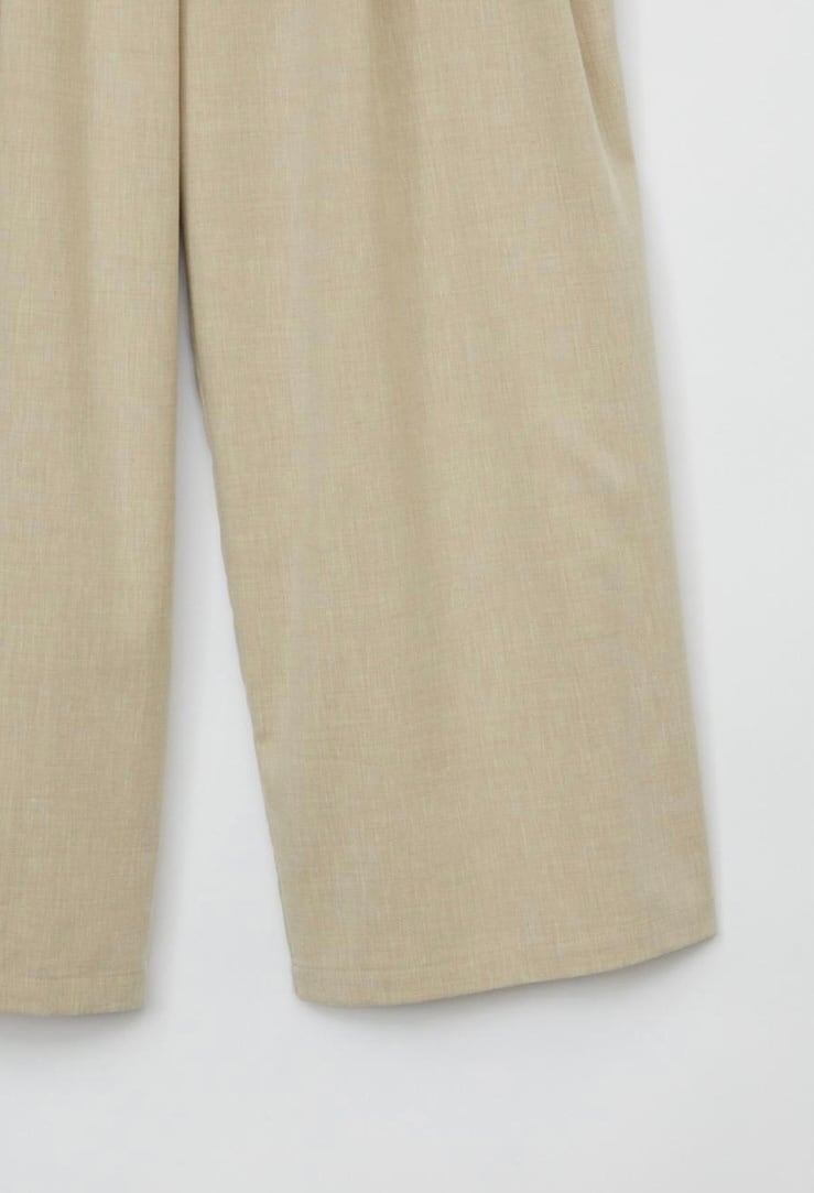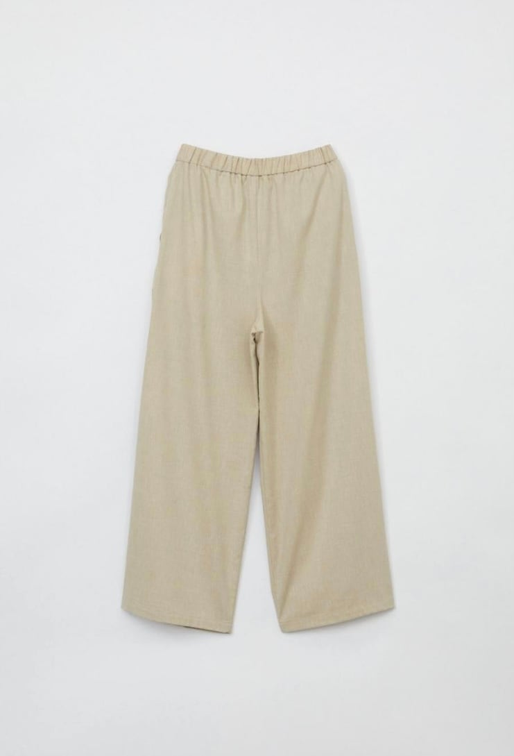 ベーシックで流行りにとらわれないたっぷりとしたワイドなシルエットで履き心地はサラリと軽く、ウエストはワンタックの総ゴムでラフな印象ながらもどこかリュクスなムード漂うアイテムです。ディティールがシンプルなのでトップスを選ばずデイリー使いに最適。麻をブレンドすることにより清涼感のあるシャンブレー素材は柔らかく程良いドレープ性と光沢感が美しいパンツです。同素材のブラウスとセットアップの着こなしもおすすめです。