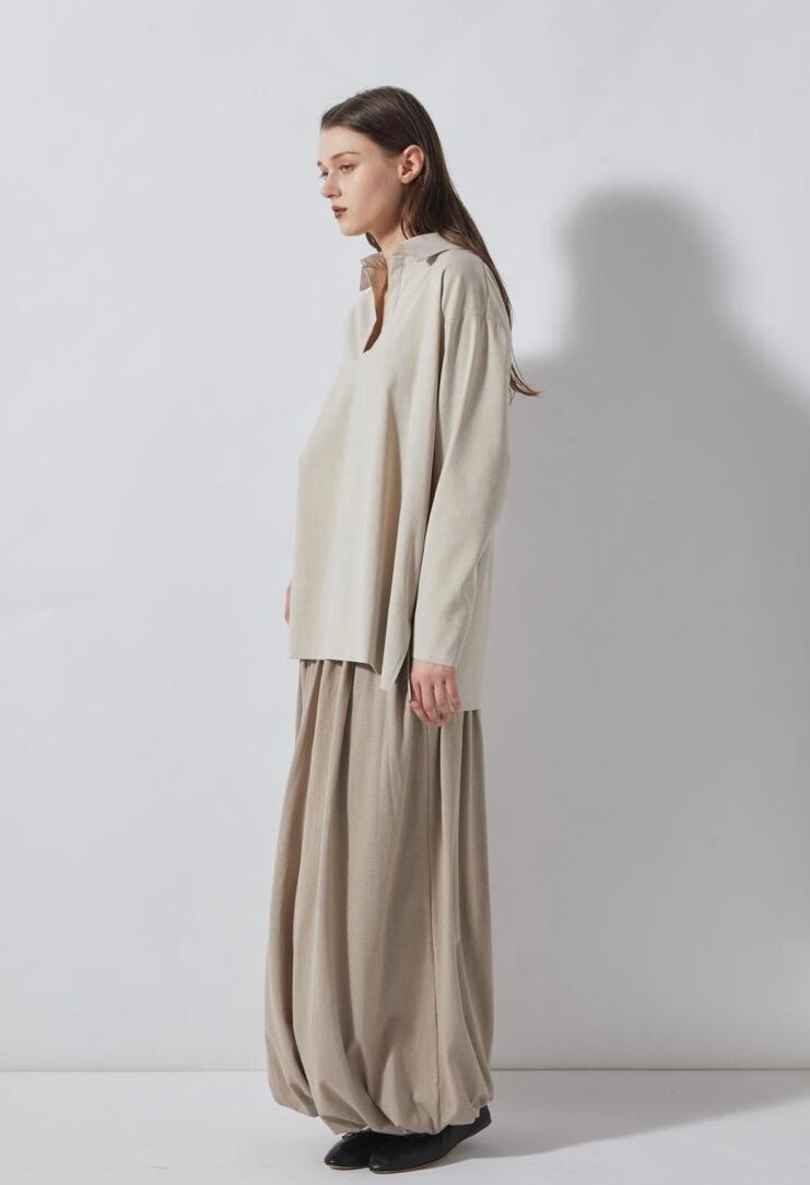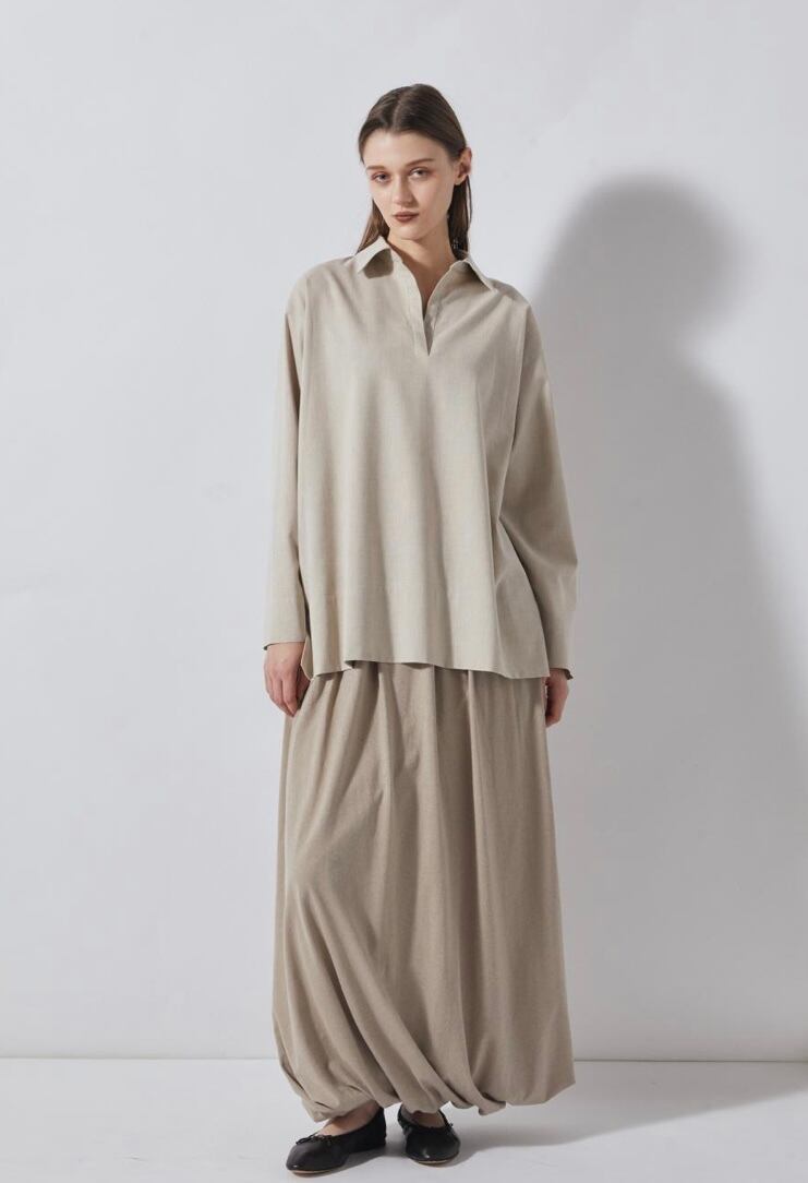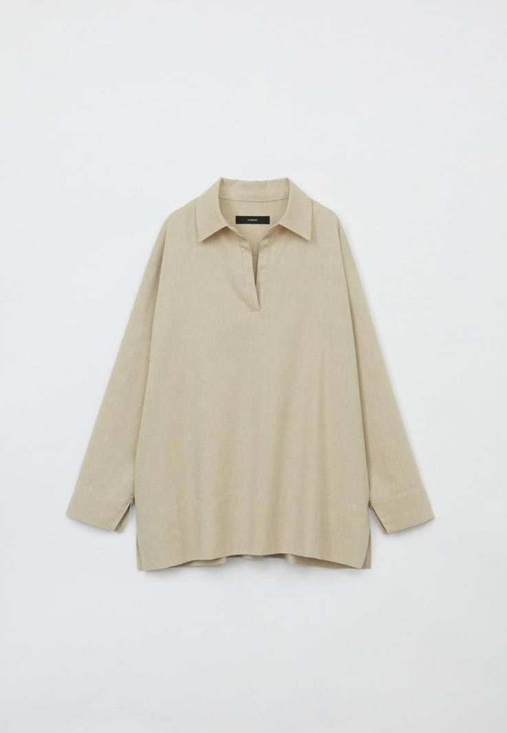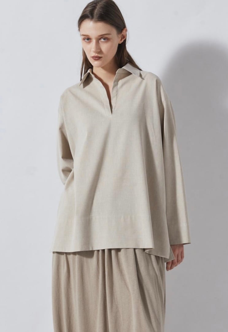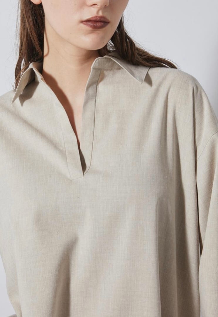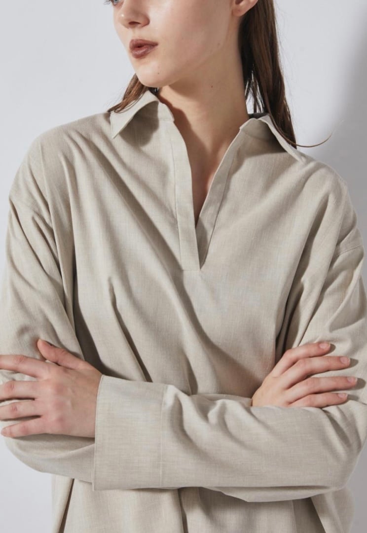 麻をブレンドすることにより清涼感のあるシャンブレー素材スキッパーシャツ。ゆったりとした袖丈幅とすっきりとしたネックがほどよくリュクスでラフなムードを作ります。少し後ろに抜いた着こなしもおすすめ。ややたっぷりとした身幅感で体の線を拾わず気軽に着用していただけます。パンツだけでなくスカートにも合わせやすく、幅広いスタイリングが可能です。同素材のパンツとセットアップの着こなしもおすすめです。
