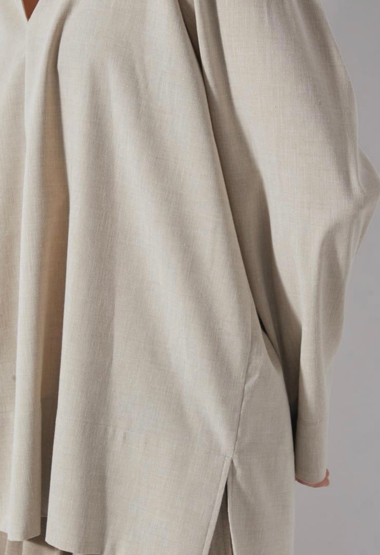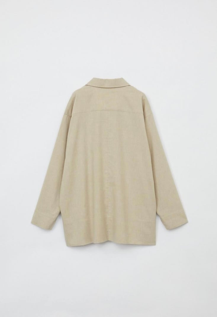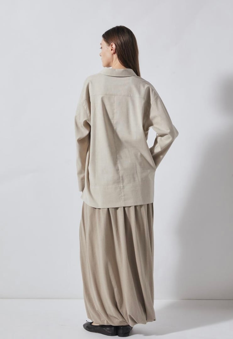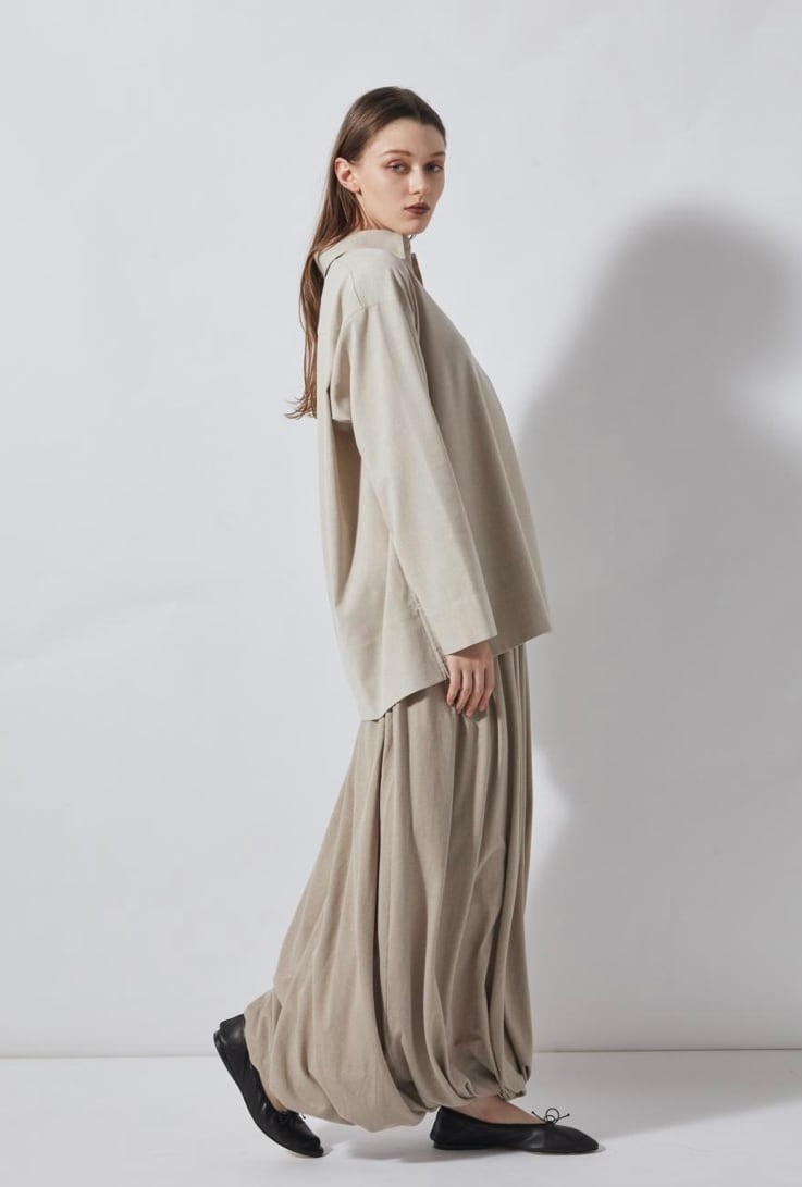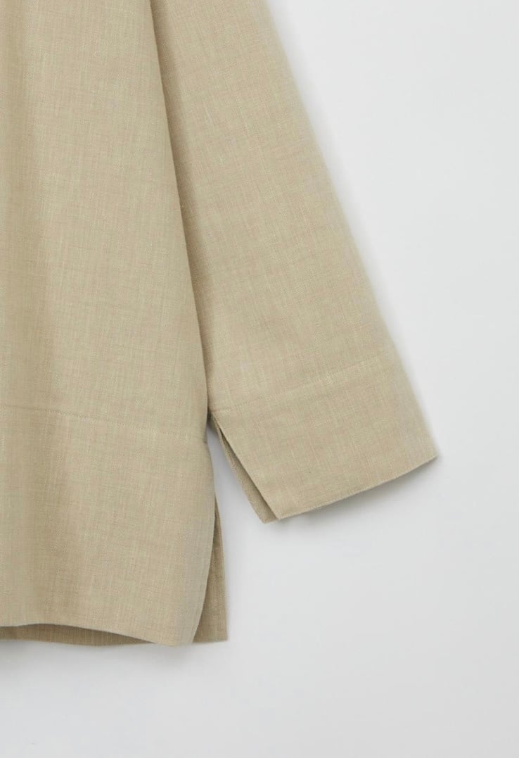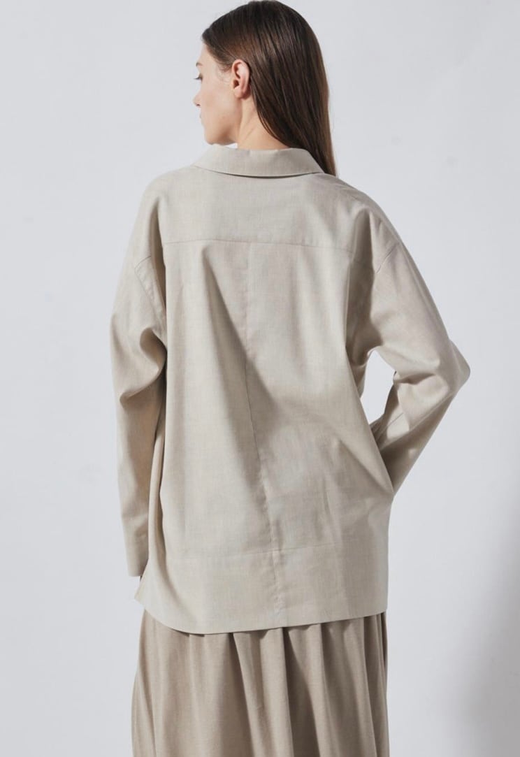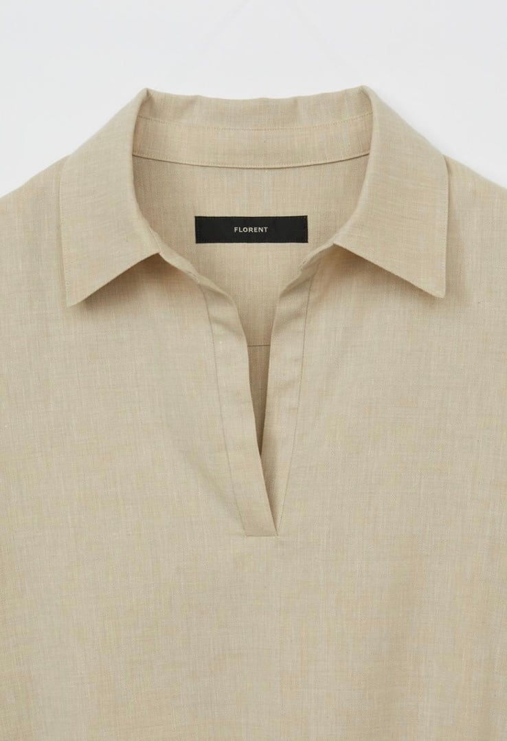 麻をブレンドすることにより清涼感のあるシャンブレー素材スキッパーシャツ。ゆったりとした袖丈幅とすっきりとしたネックがほどよくリュクスでラフなムードを作ります。少し後ろに抜いた着こなしもおすすめ。ややたっぷりとした身幅感で体の線を拾わず気軽に着用していただけます。パンツだけでなくスカートにも合わせやすく、幅広いスタイリングが可能です。同素材のパンツとセットアップの着こなしもおすすめです。