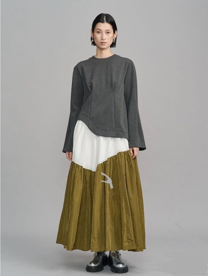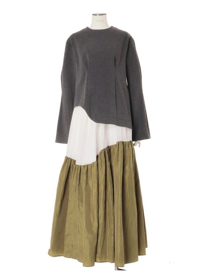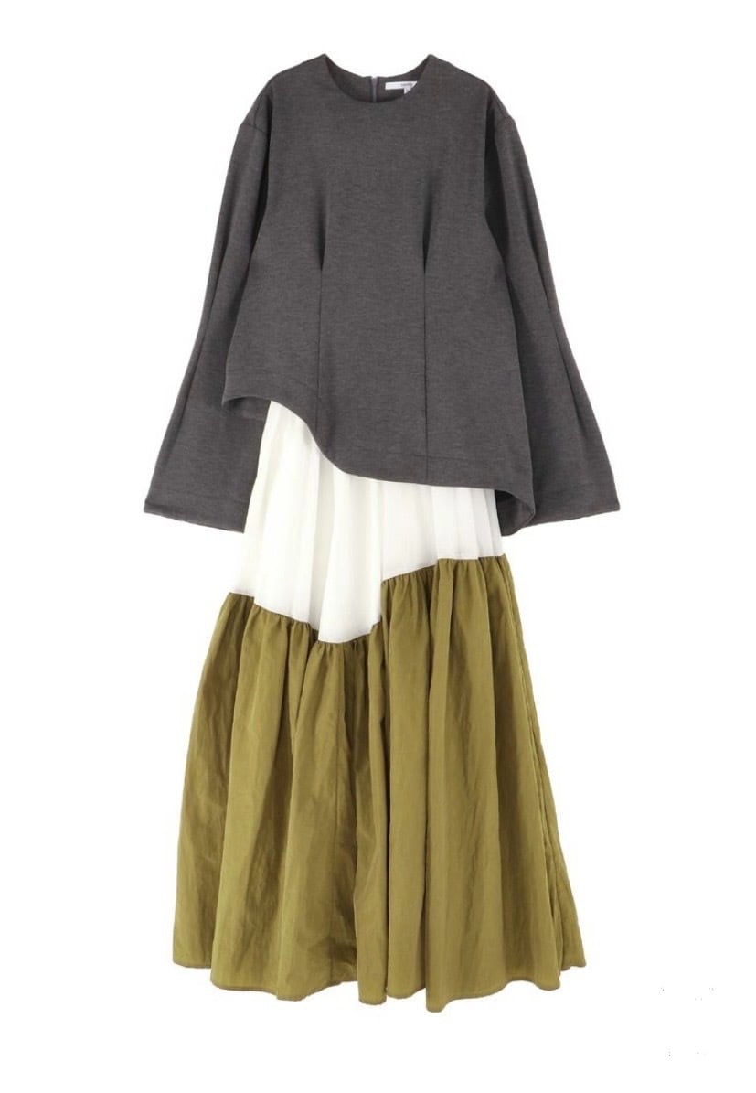 ボリュームたっぷりのギャザースカートと、構築的なカットソートップスをドッキングした、存在感のあるワンピース。