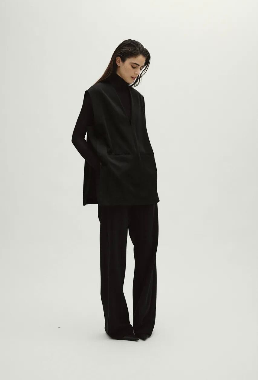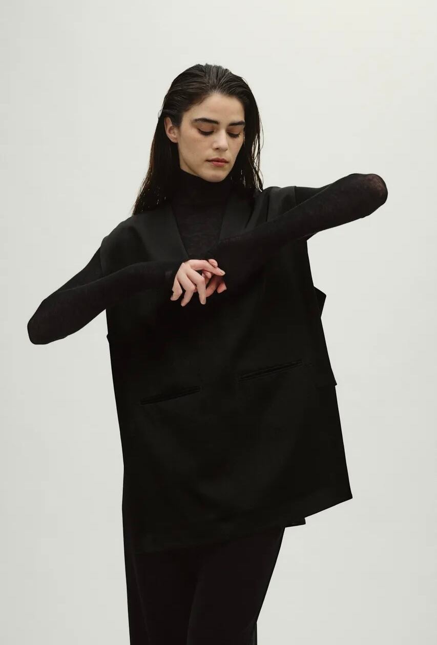シャープなネックラインと動くたびに優雅なドレープを生む、生地のたっぷりとした分量感が特徴です。