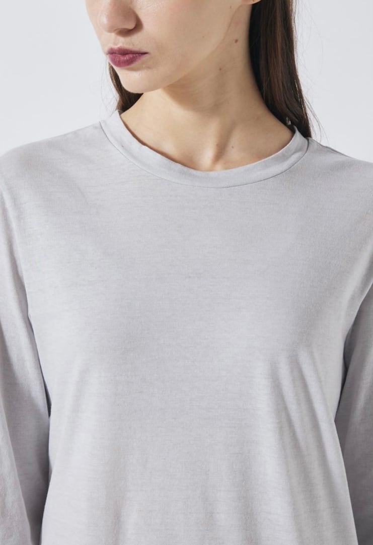 ヴィンテージのような見た目ながらシャープで上品な印象も感じられる、コットン100%のクルーネックトップス。ほど良くボディにフィットするシルエットにコンパクトなネックラインでクリーンな女性らしい印象の一着。一枚ではもちろん、シャツやニットとのレイヤードスタイルのインナーとしてもおすすめです。プレーンなデザインでどんなスタイリングにも馴染み、幅広いシーンで活躍してくれるベーシックアイテムです。