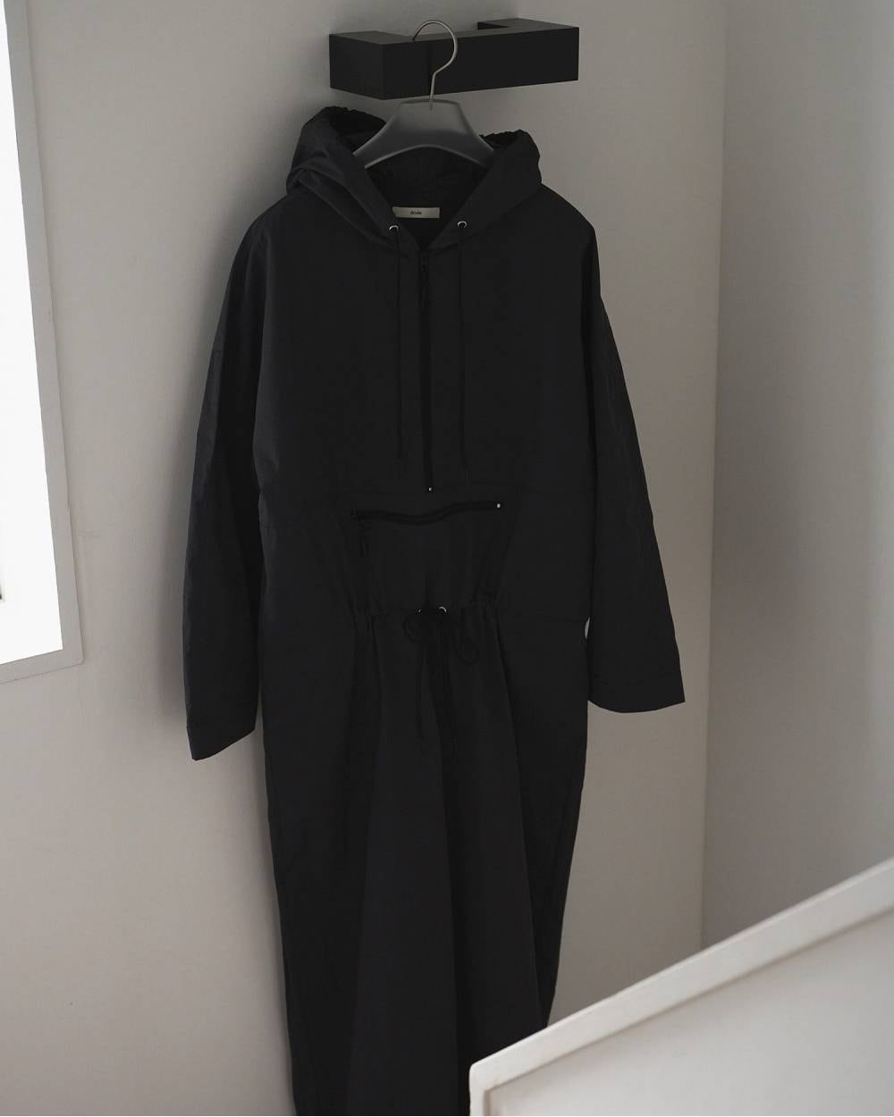 スポーティーなナイロンフーディーをラフなコンビネゾンに仕上げた一着。ゆったりとしたシルエットで、ウエストや裾のドロストを絞って、シルエットを調節していただけます。腰巻きしたり、キレイめのジャケットを合わせたり、少し表情の異なるアイテムをミックスすることで、こなれた印象に。クリーンなイメージのホワイトと、ニュアンスあるチャコールグレーの2色。幅広いカラーリングと好相性で、春らしい明るいカラーアイテムとのスタイリングもおすすめ。ボトム部分は膝上までの裏地付きです。