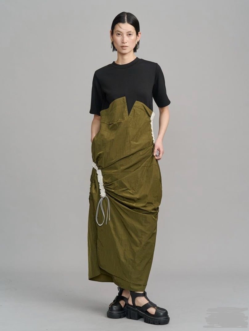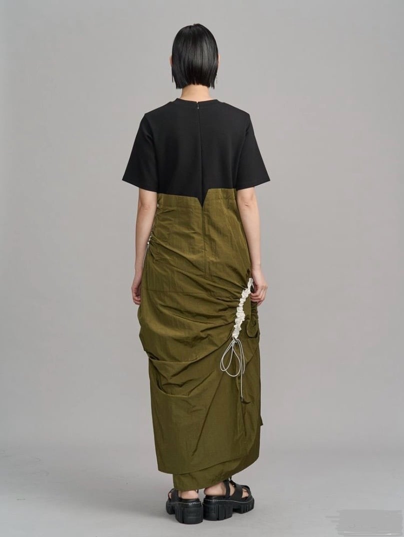 Tシャツとギャザーの入ったの構築的なスカートをドッキングした、モードなワンピース。