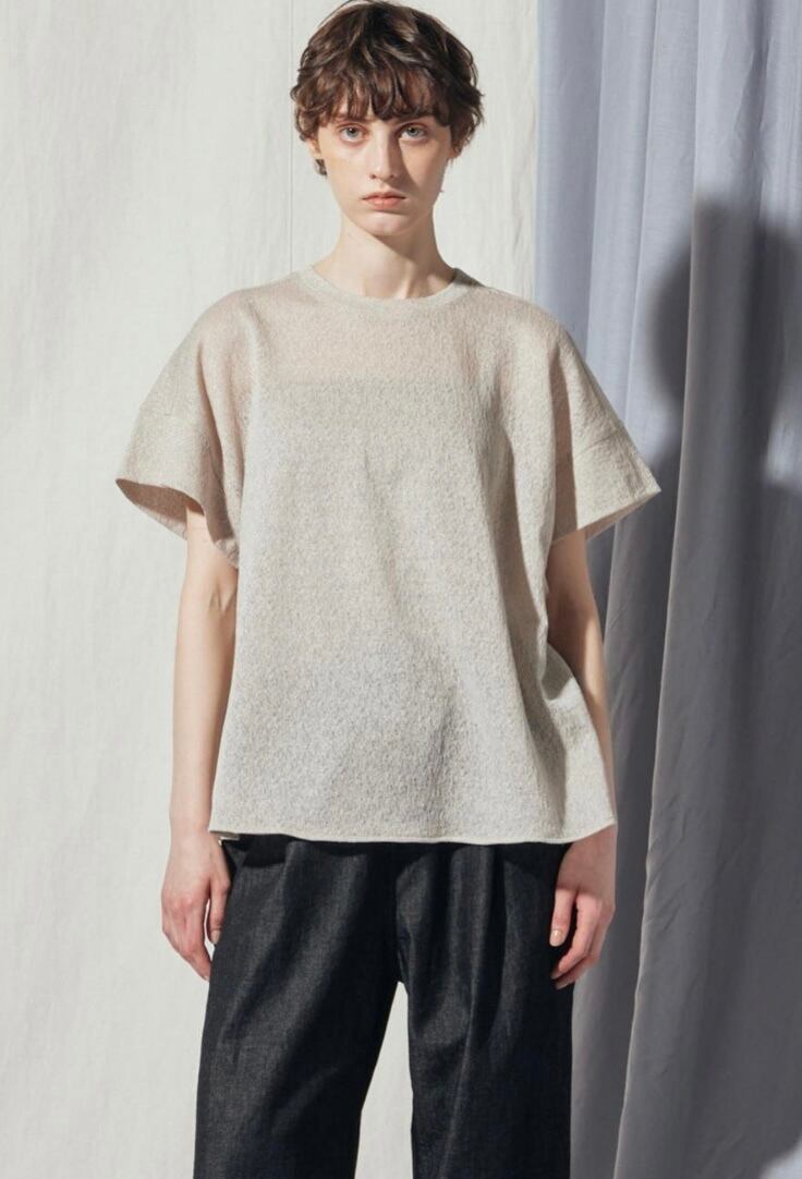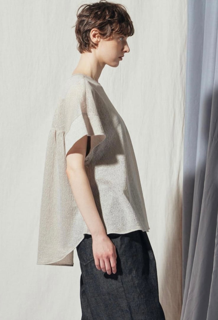 コットンのナチュラルな質感にサラリとした爽やかなタッチが加わったジャカード素材を使用したショートスリーブトップス。レースのような繊細な柄と軽やかな透け感にバックスタイルに入ったギャザー、ほどよくゆったりとしたフォルムで女性らしい上品さをプラス。ミニマムなシルエットなのでメインとしてもジャケットのインナーとしても着られるのも嬉しいポイントに。さまざまなコーディネートで活躍出来る1着。