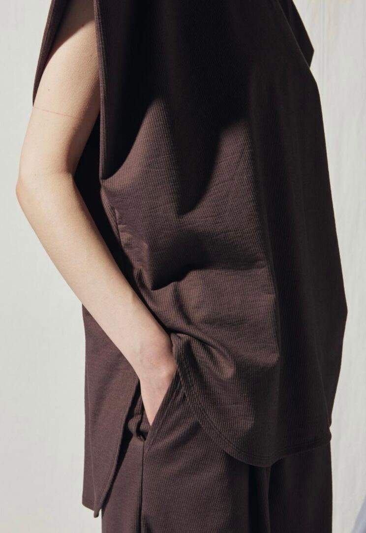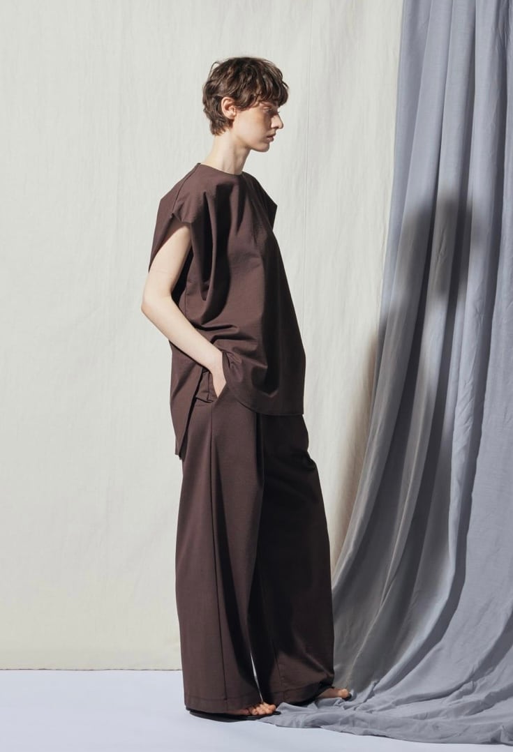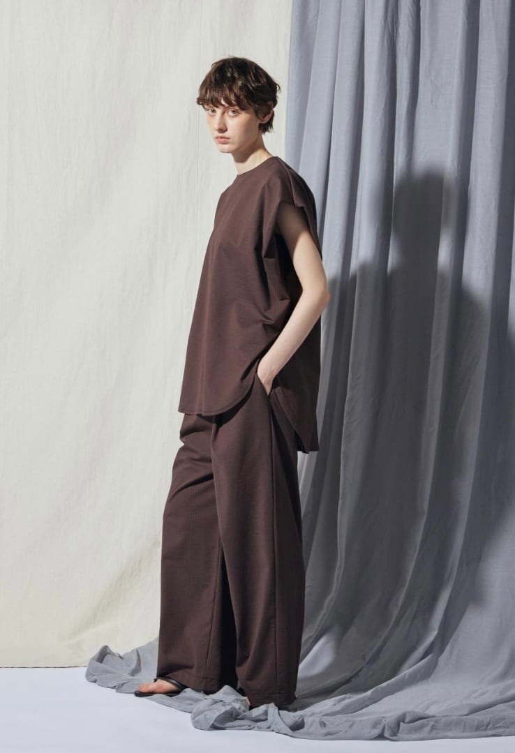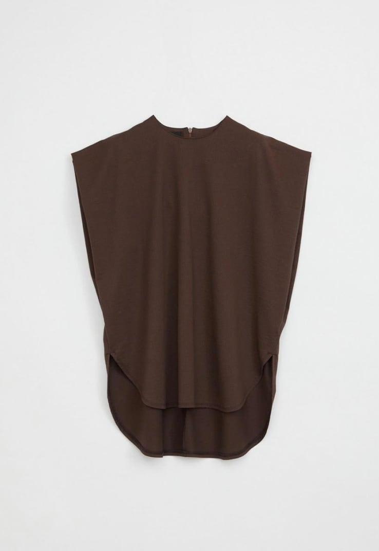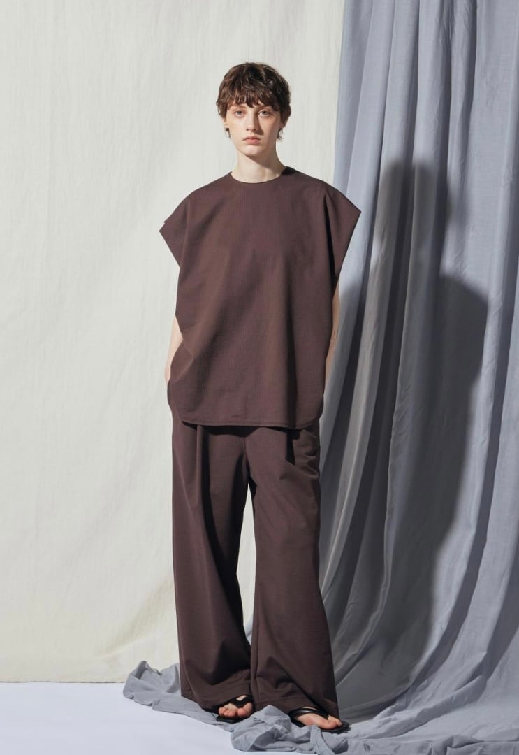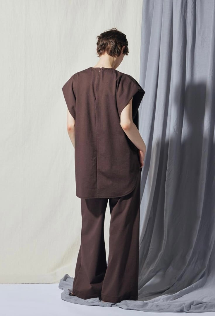 細かな凹凸が生み出す立体感のある表情が特徴のコットンサッカージャージー素材のトップスです。上身頃は立体的でややボックス型になっていて後ろはジップ仕様に。詰まり目な襟元も安心で、接触冷感性と吸水速乾性が備わっているので、汗ばむ季節も快適に。シーズンレスで取り入れやすく、カットソーをレイヤードしてベストのようにもお使いいただけます。同素材のパンツとセットアップで着用することも可能。