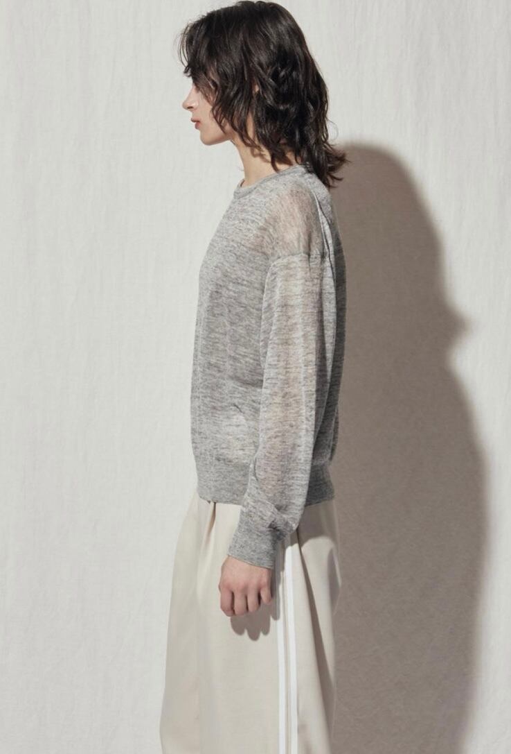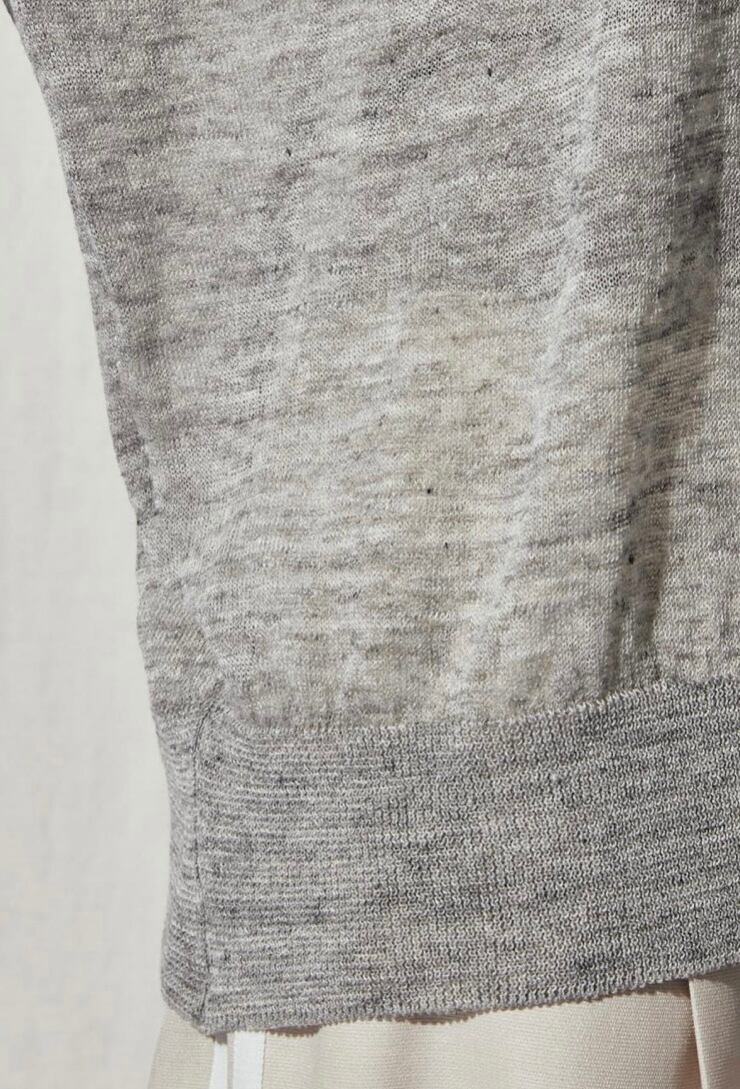 細い糸番手の繊細で光沢のある麻にナイロンを絡ませて軽く清涼感があり、エレガントな素材のニットトップス。ボディ・スリーブ共にほど良くゆとりを持たせたシルエットながら、裾をリブで締めることで自然とブラウジングされパンツからスカートまでどんなボトムスともバランス良く合わせていただけます。繊細な透け感でこれからの季節に活躍してくれる、大人のカジュアルスタイルにぴったりのアイテム。